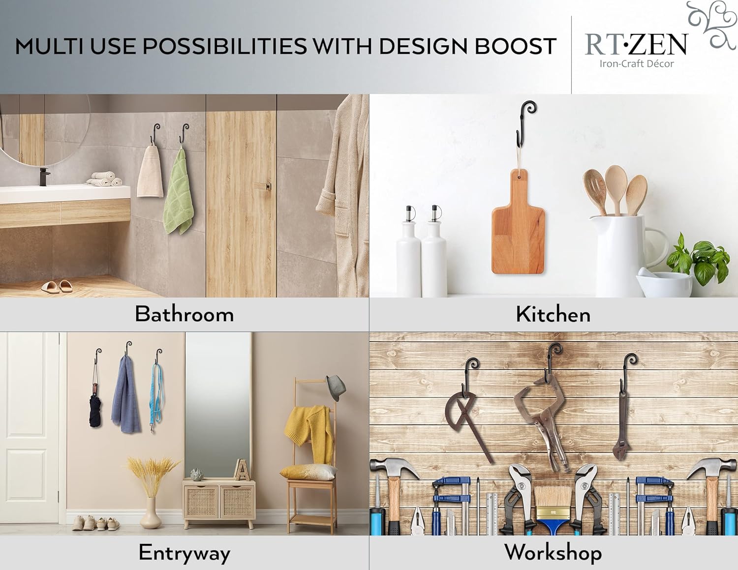 RTZEN Wall Mount Hook Set - Wrought Iron Decorative Rustic Metal Coat Hooks for Hanging - Handcrafted Classic Farmhouse Wall Mounted Black Hooks for Towel Robe or Hat Hanging - 3 Pack