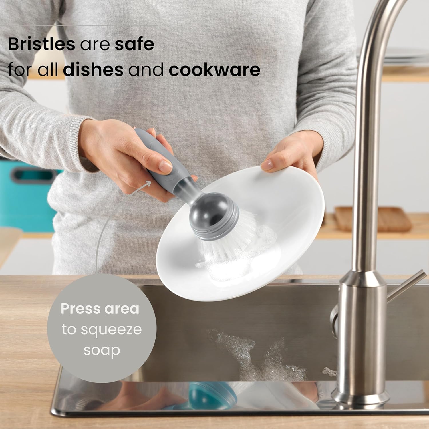 - Durable Kitchen Brush: This dish brush has powerful nylon bristles that scrub grease and baked-on food without scratching non-stick surfaces. Dishwasher-safe with a secure grip, it's ideal for dishes, countertops, and sinks.
