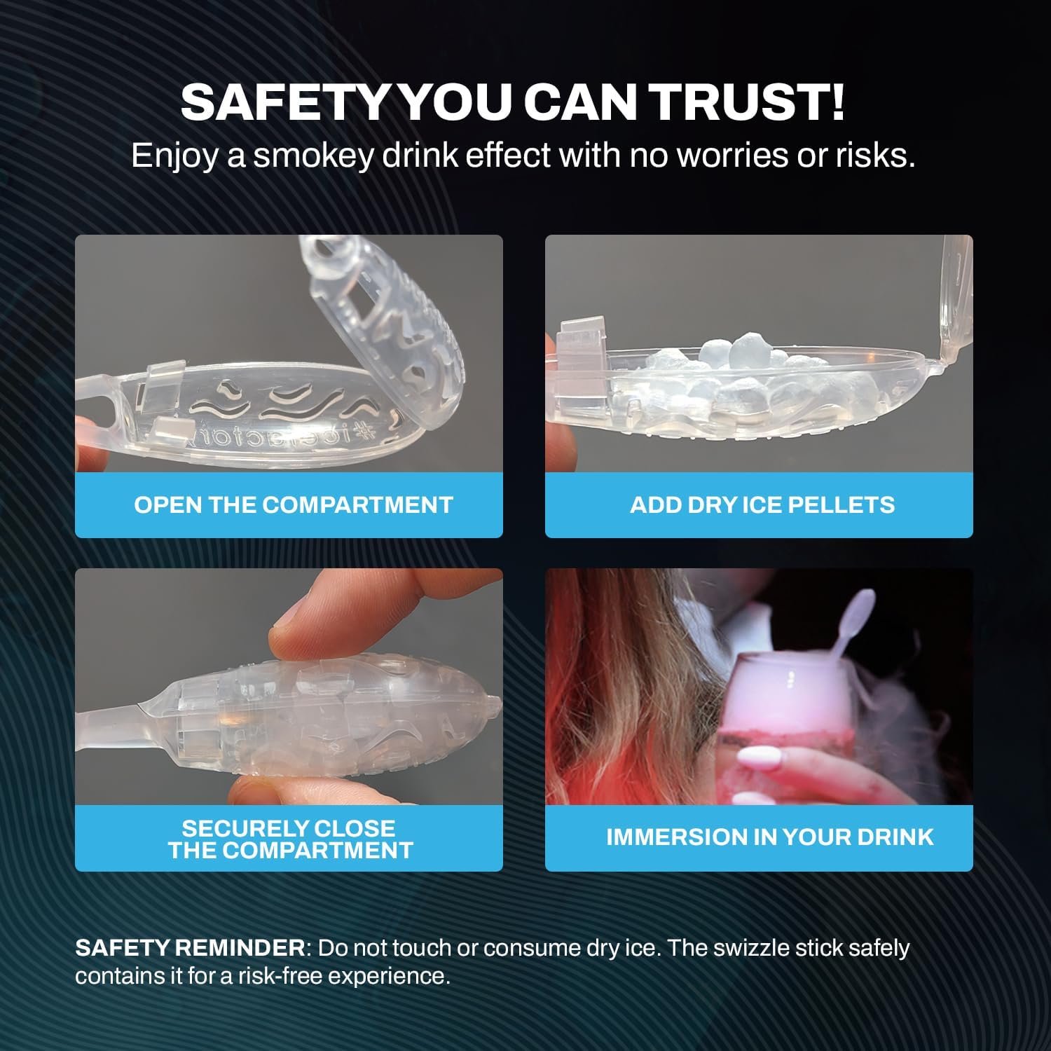 - GLOW IN THE DARK SMOKY DRINKS: Make your event unforgettable with our swizzle sticks to add a glowing, dramatic effect to any beverage; These stirrers create a mesmerizing smoky effect when used with food-grade dry ice pellets, dry ice not included