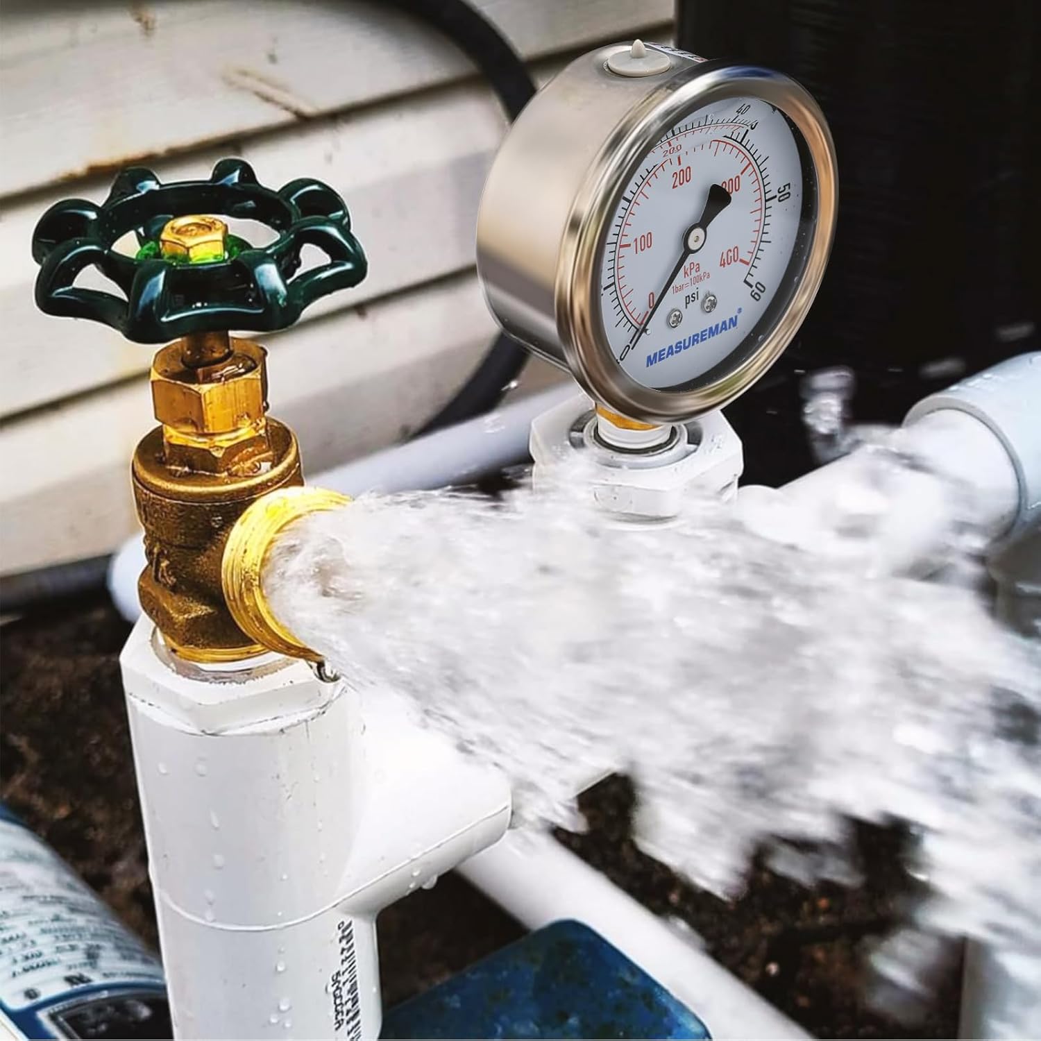 MEASUREMAN 2-1/2inch Dial Size, Liquid Filled Pressure Gauge, 0-60psi/kpa, 304 Stainless Steel Case, 1/4inNPT Lower Mount