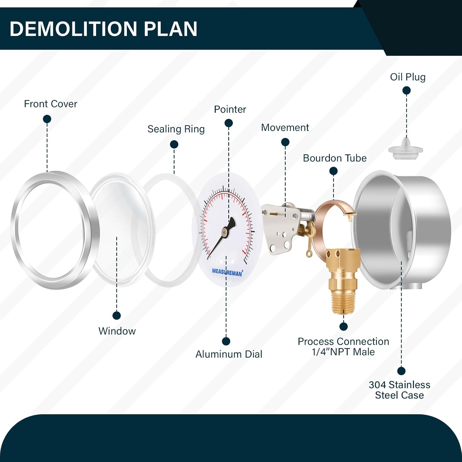 - Stainless steel case, brass wetted parts, glycerin filled