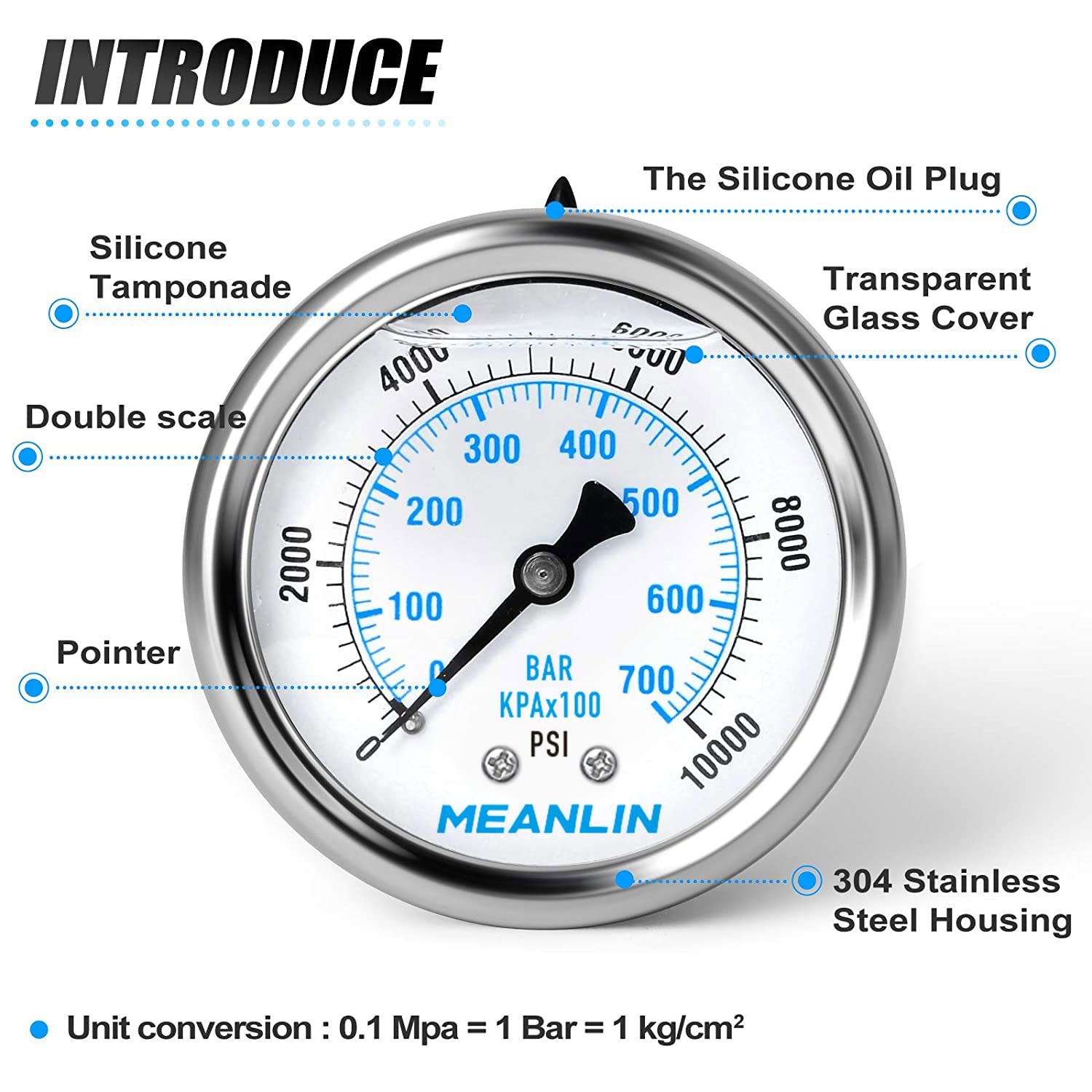 MEANLIN MEASURE 0~10000Psi Stainless Steel 1/4" NPT 2.5" FACE DIAL Liquid Filled Pressure Gauge WOG Water Oil Air Center Back Mount, with 1/4" x 1/2" NPT and 1/4" x 3/8" NPT Hex Bushing