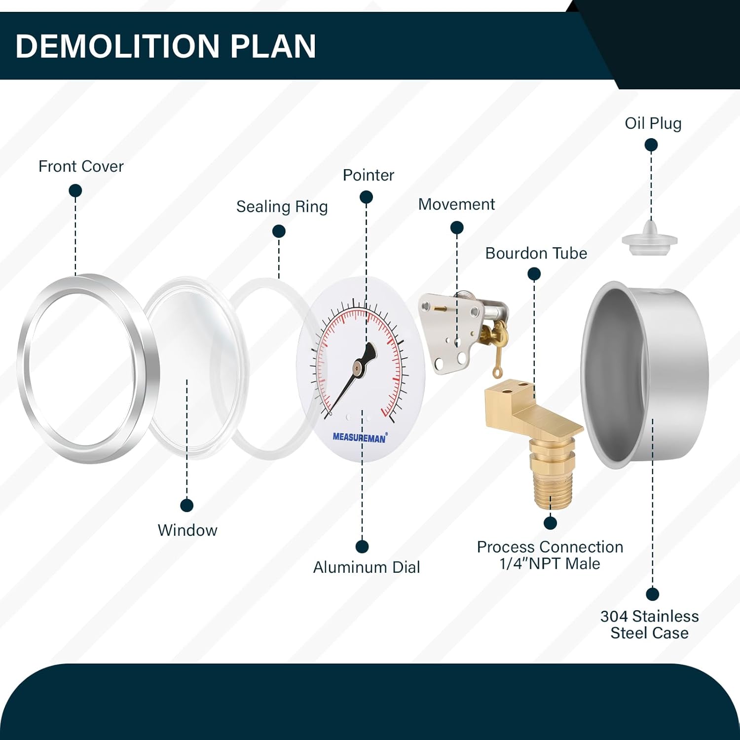 MEASUREMAN 2-1/2inch Dial Size, Glycerin Filled Pressure Gauge, 0-200psi/kpa, 304 Stainless Steel Case, 1/4inchNPT Center Back Mount