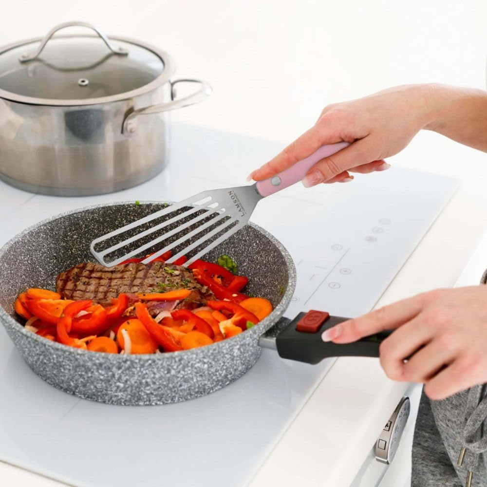 - The Chef's Slotted Turner is specially designed to flip delicate foods. The turner is lightweight and razor-thin, so it can flip eggs, fish, and crepes. It is also strong enough to lift heavier foods like hamburgers. The long slots allow excess grease to drain.