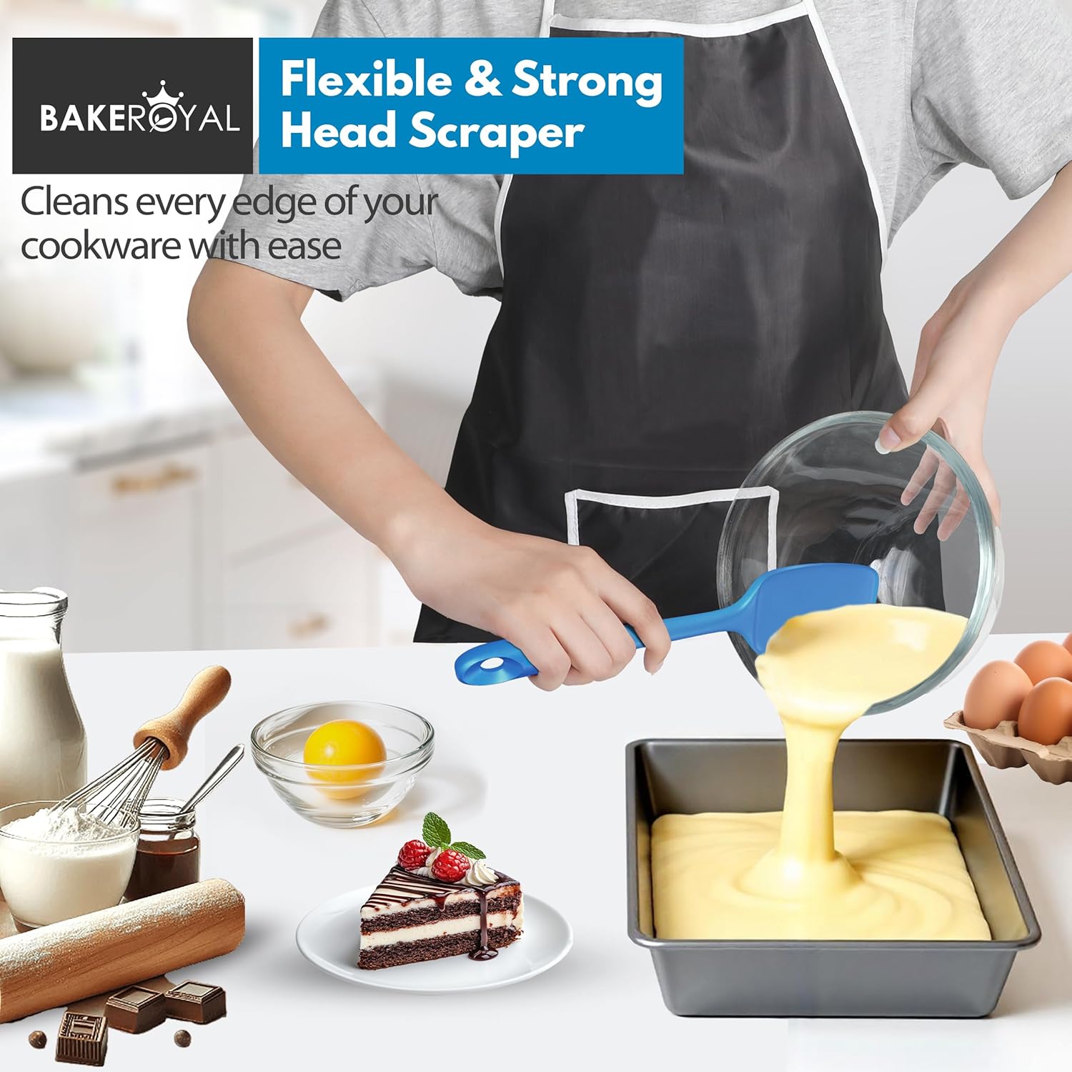- ROYAL TASTE MAKER: This Bake Royal rubber spatula set includes Large, Mini, Spoon, and Jar are the best minimalist kitchen essentials that come with every spatula a new or experienced baker could need to whip up some delicious food. From frosting cakes, scraping batter, Heavy sticky and soft mixing, butter icing, flipping pancakes, scooping dough, to getting the last bit out of the jar done with these well-balanced, functional, and stylish tools that also add a pop of color to your kitchen.