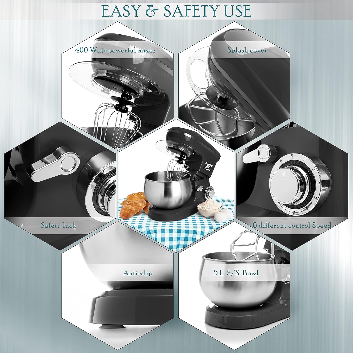 - Full Set Cake Mixer: Moss & stone standing mixer comes with 3 mixing attachments accessories: whisk, dough hook, mixing beater made from solid aluminum. The stand up mixer has an extra splash lid guard with an access hatch, which helps to add more ingredients without dirtying your countertop.