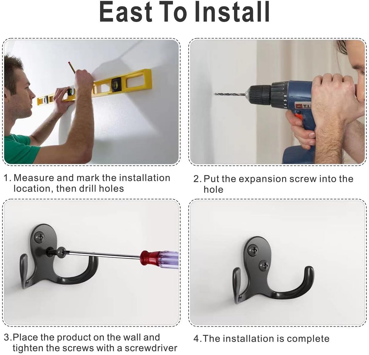 - Size: The Hooks for hanging coats dimension is 2.8 x 1.89 inches, Length of screws: 0.78icch, The screws are hardened and very strong