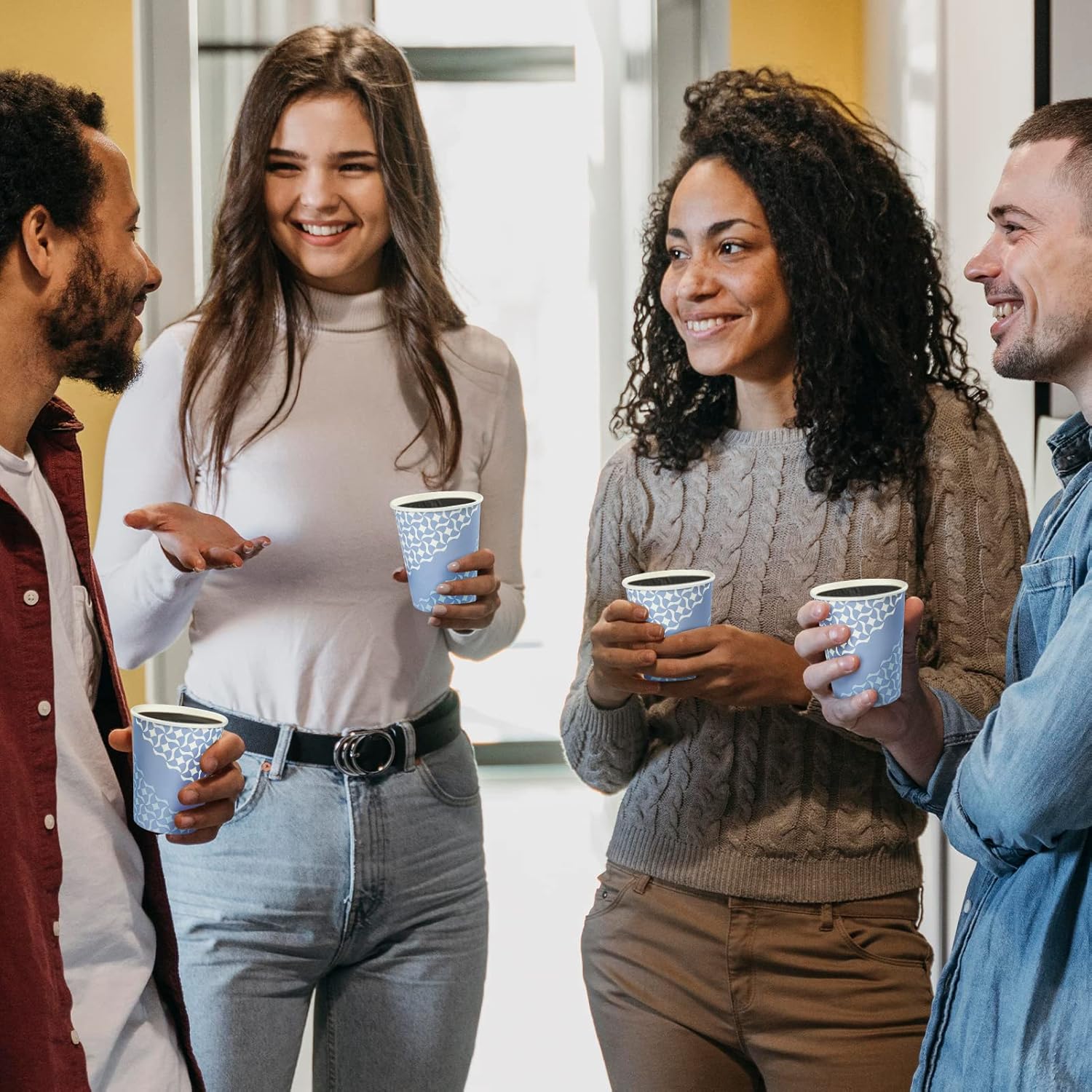 - Design: These disposable paper cups are made of made of thickened paper. The 10 oz coffee cups feature a blue pattern design, offering a minimalist look without being dull