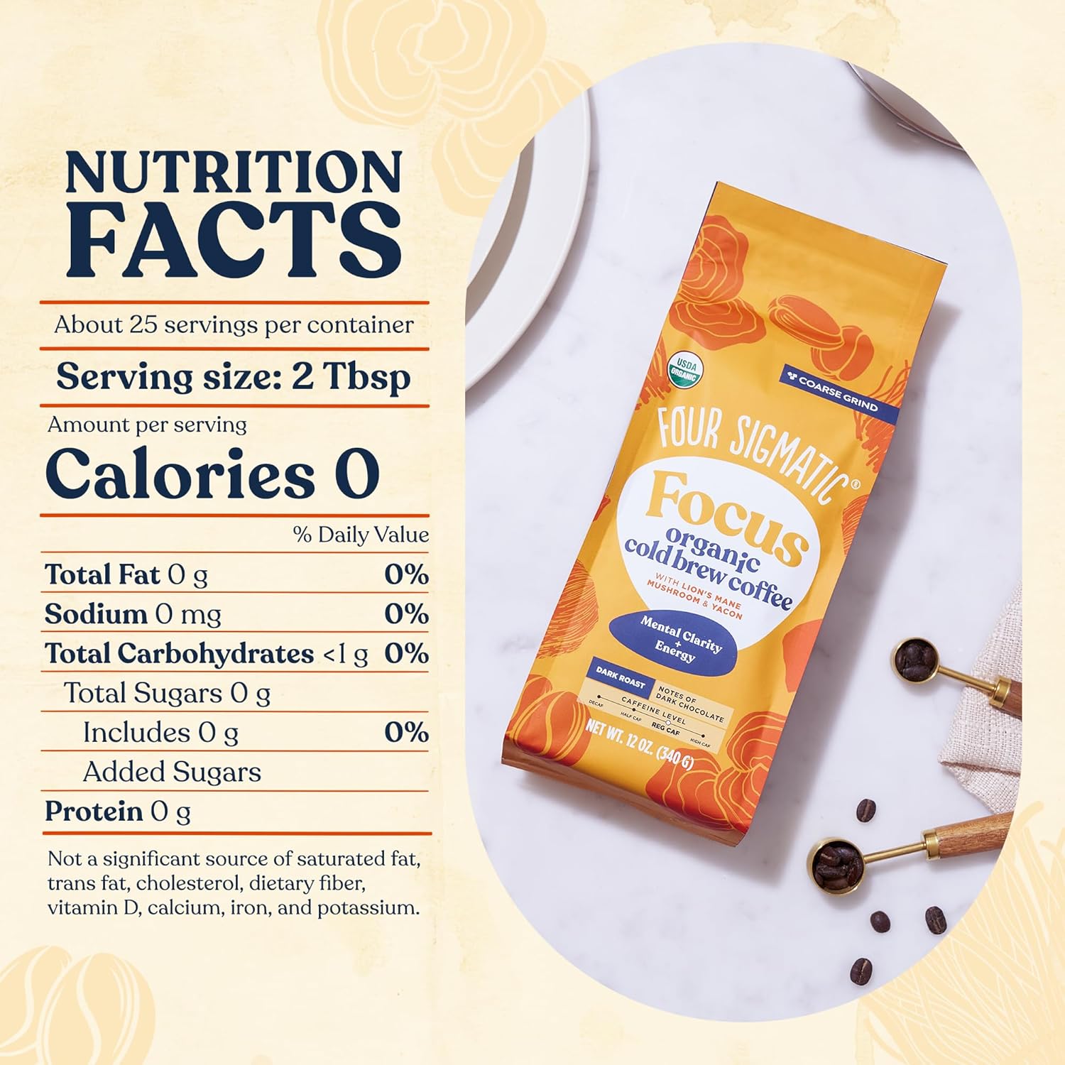 Four Sigmatic Organic Cold Brew Coffee Grounds | Dark Roast, Coarse Grounds with Lion's Mane and Chaga | Cold Brew Mushroom Coffee for Crash-Free Focus | 12 oz Bag