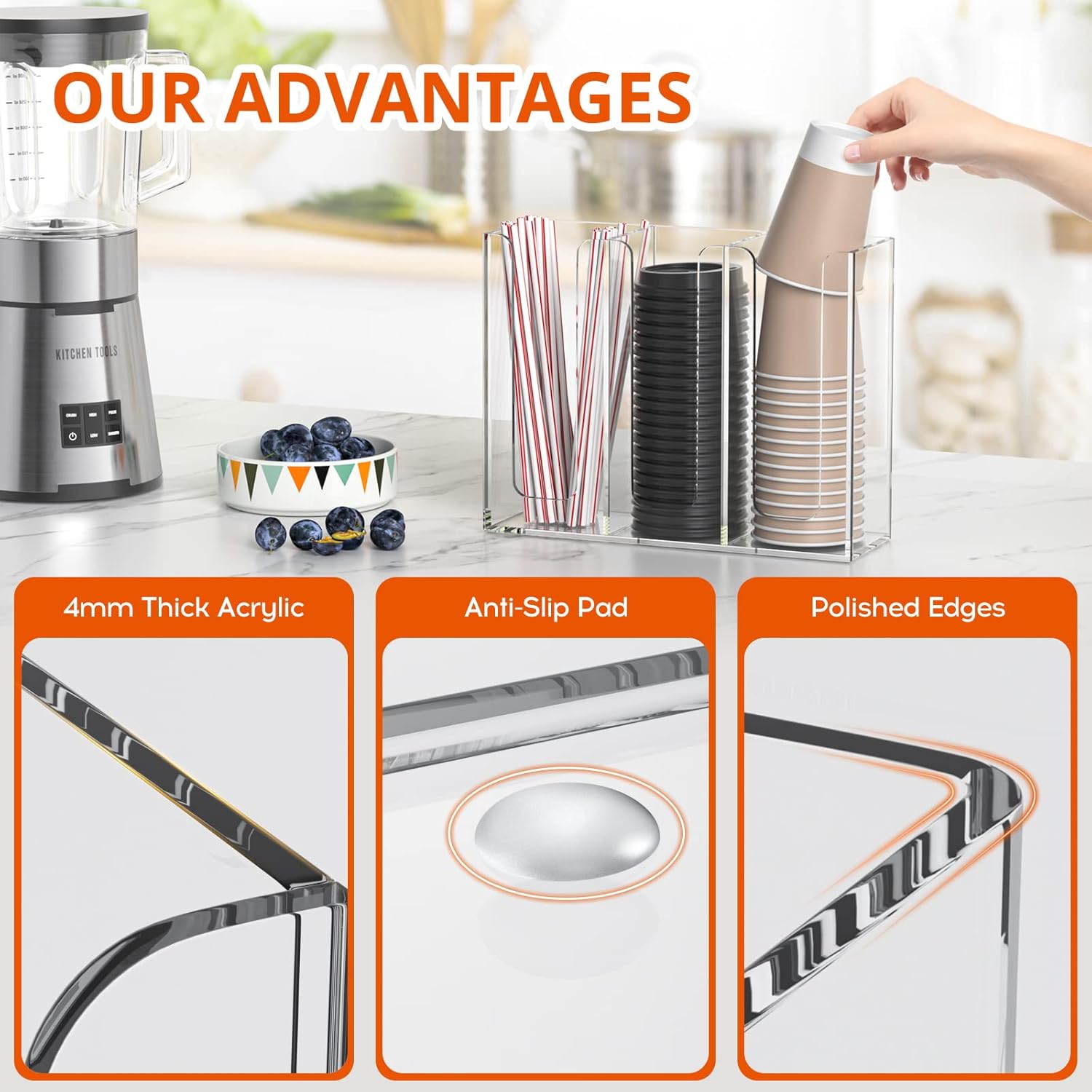 - 3 Section Design - the cup and lid organizer comes with 3 individual section, disposable cups and lids, coffee tea condiments can be storaged separately without any mess, it won't take much space of your countertop, making it look neater and more organized.