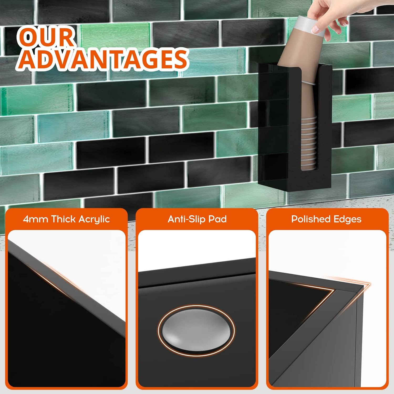 - Functional - comes with 2 pre-drilled holes on the back of the acrylic cup dispenser storage organizer, it can be either mounted on wall or placed on countertops of your bathroom, kitchen, office, coffee station.