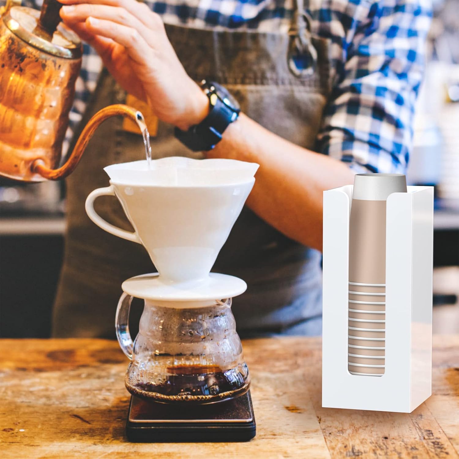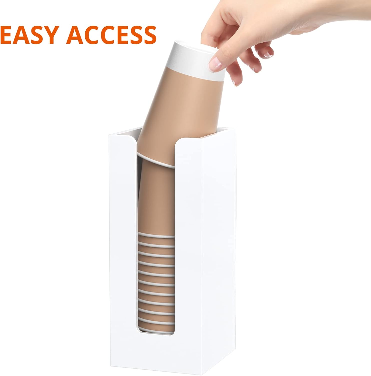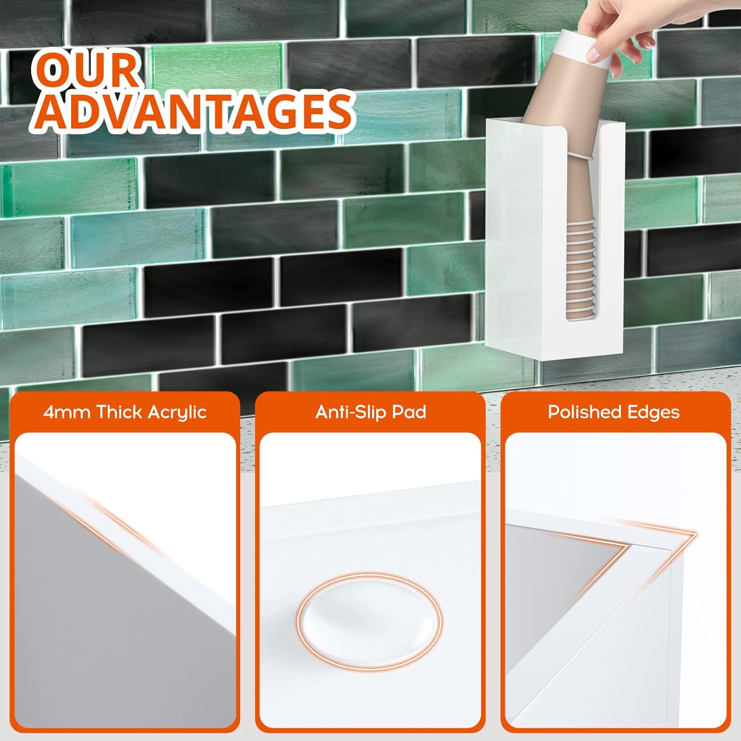 - Functional - comes with 2 pre-drilled holes on the back of the acrylic cup dispenser storage organizer, it can be either mounted on wall or placed on countertops of your bathroom, kitchen, office, coffee station.