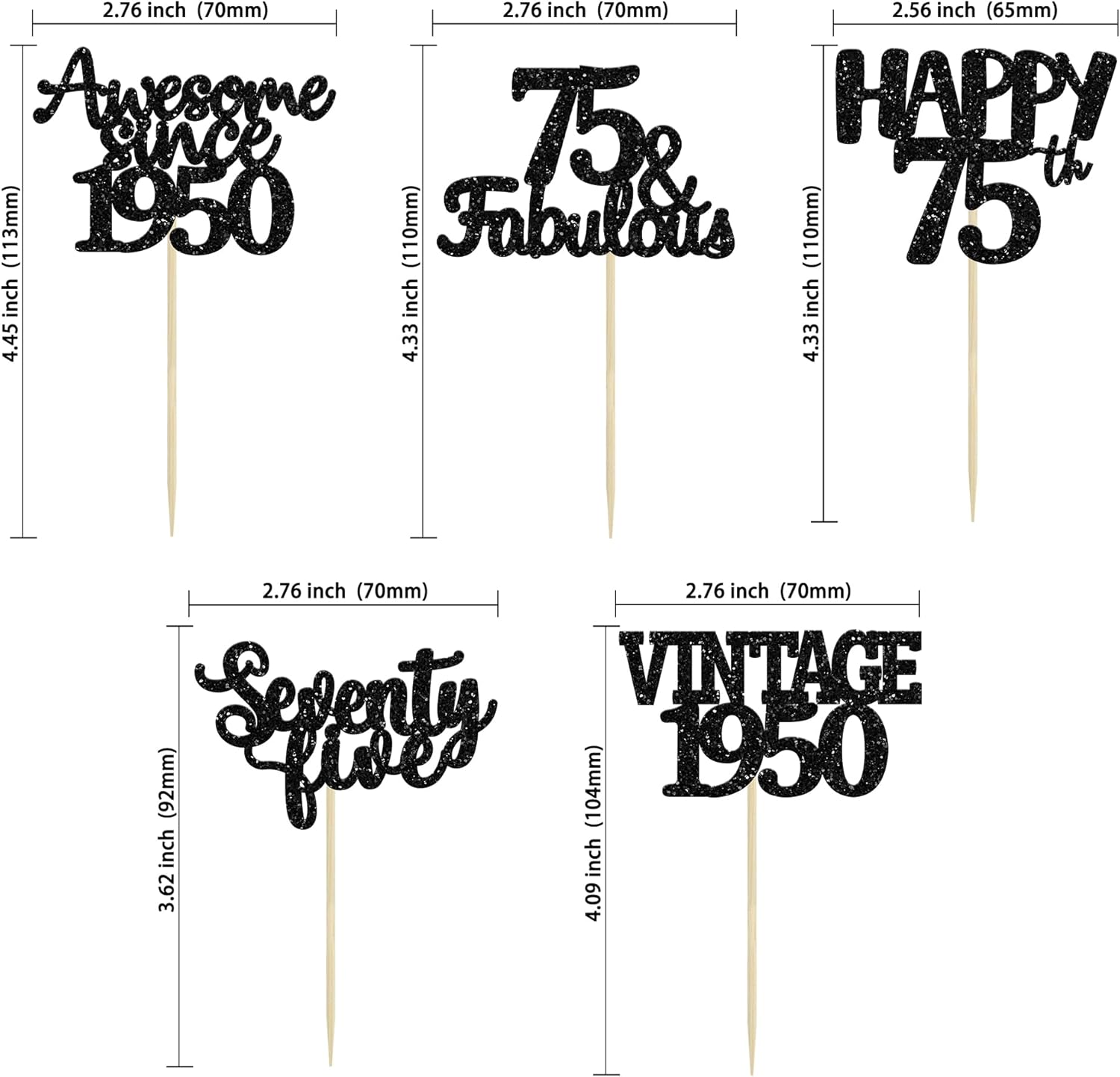 - ♡These glitter Black 75 Cupcake Toppers are so cute and good for vintage 1950 theme party, 75th birthday party, 75th wedding anniversary birthday party cake decoration. They can make your cupcake more attractive and bring the fun to your party. You can also apply them for ice cream, fruits, cookies and other desserts.