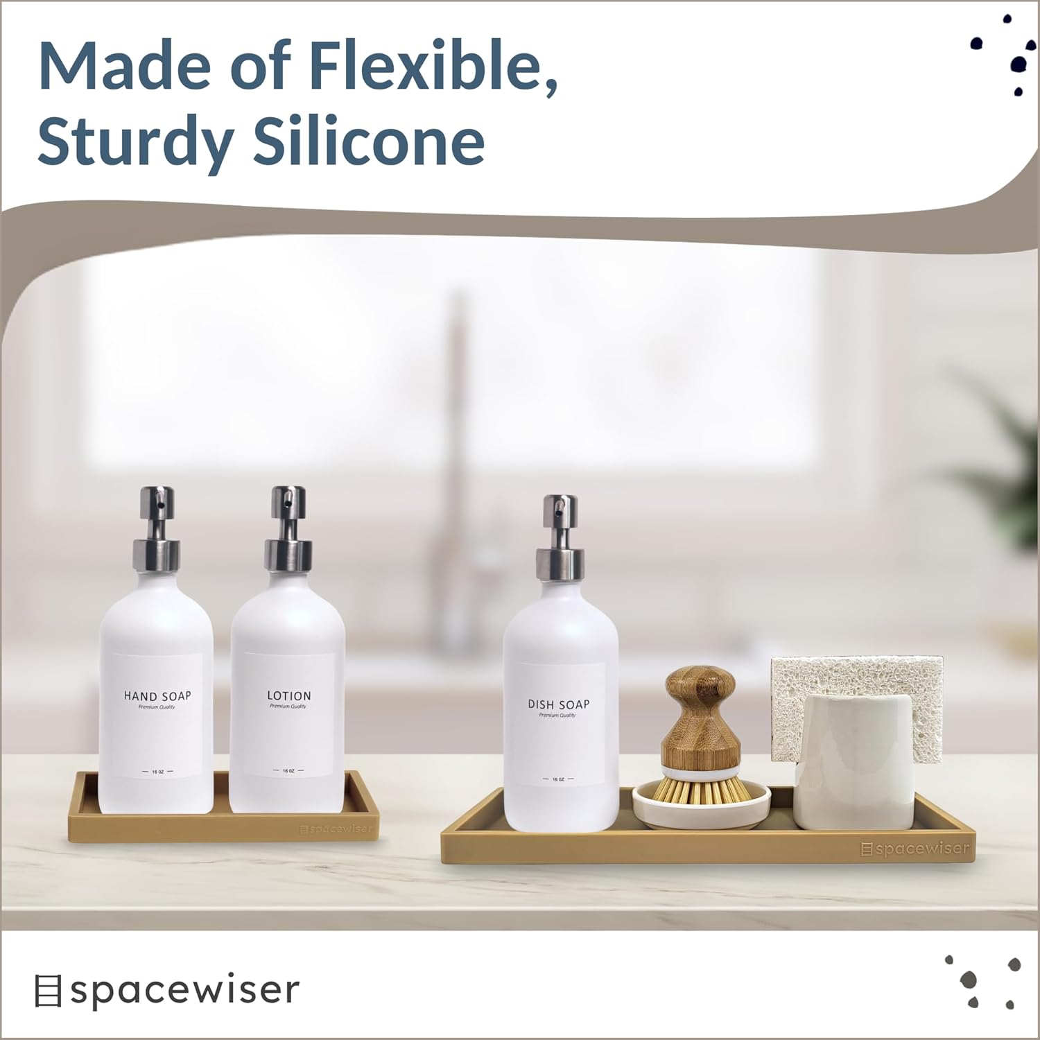 - Use Them Anywhere – Choose the endlessly useful and aesthetically pleasing trays that work anywhere. Spacewiser Original Silicone Trays work perfectly as a bathroom tray, vanity tray or kitchen sink tray. Spacewiser trays are made of premium food grade silicone, without the addition of potentially unsafe thickening and hardening agents or chemicals. They’re shatterproof, waterproof, slip-resistant, heat resistant to 425F, and dishwasher safe.