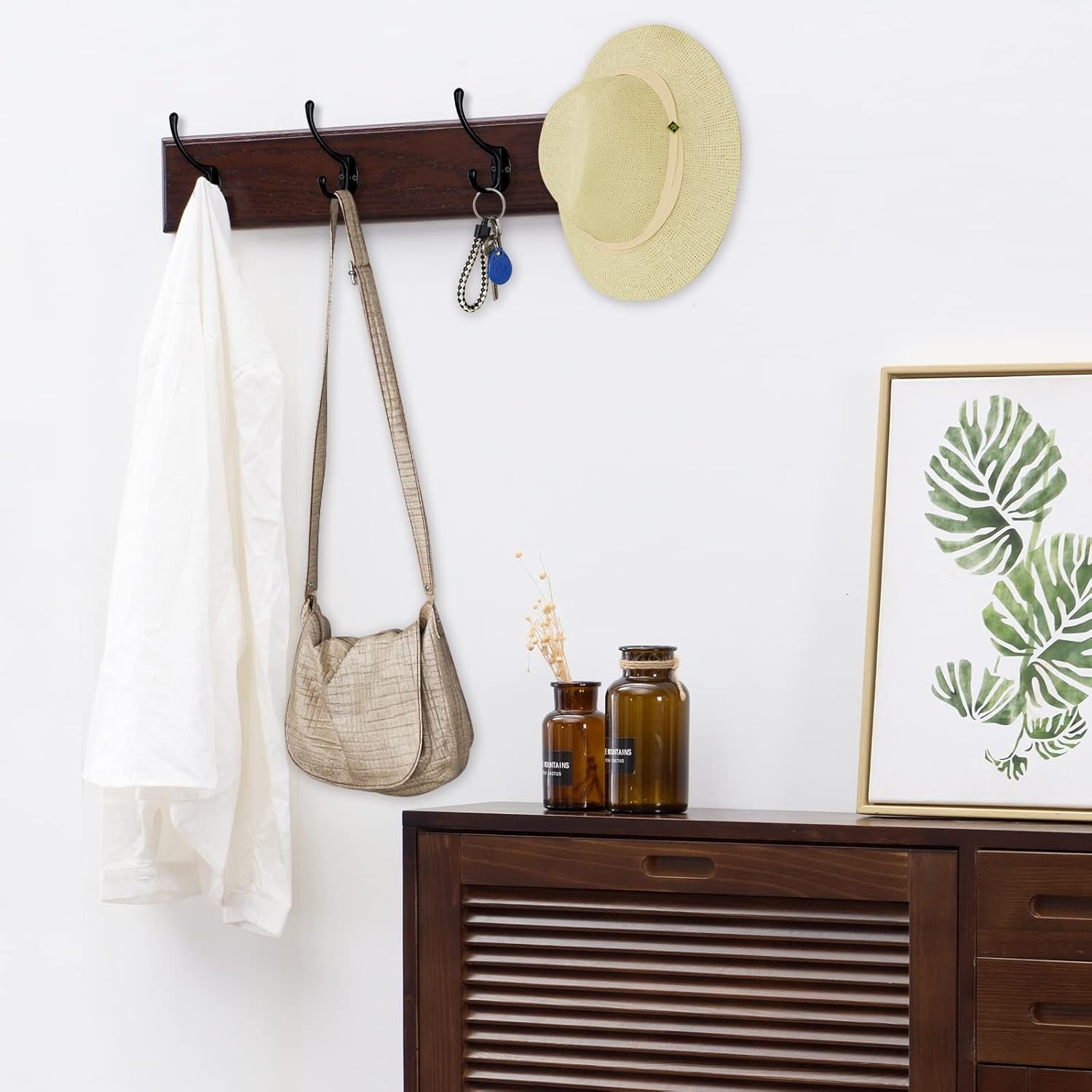 - High Quality Material:These heavy duty dual prong hooks are made of good quality zinc die cast material, the screws are made of iron, no rust, it can easily hold up to 35 lbs of weight. Hard and sturdy, can widely support coat, scarf, umbrella, bag, towel, key, hat, cup as well as Christmas socks and Christmas wreath
