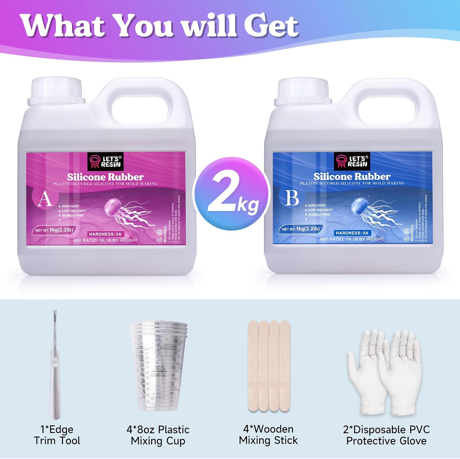 - 【70.5OZ ALL IN ONE MOLD MAKING KIT】: LETS RESIN silicone mold making kit comes with 2 bottles of liquid silicone rubber, each bottle containing 1kg/2.2 lbs casting silicone, as well as 4 pcs x 8oz plastic mixing cups; 4pcs x wooden mixing sticks; 2 pairs x disposable protective gloves; a perfect mold maing kit for beginners to try, satisfying your various needs