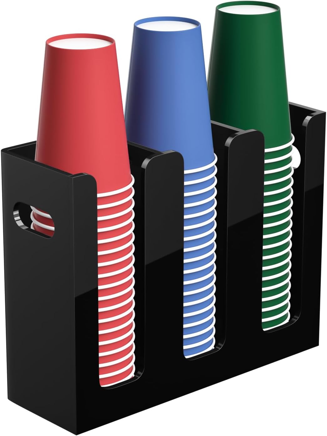 Disposable Coffee Cup Dispenser with Handles, Countertop or Wall Mount Hot/Cold Drink Cup and Lid Holder - Bathroom/Kitchen/Office Acrylic Cup Lid Storage Organizer (3 Compartments, Black)