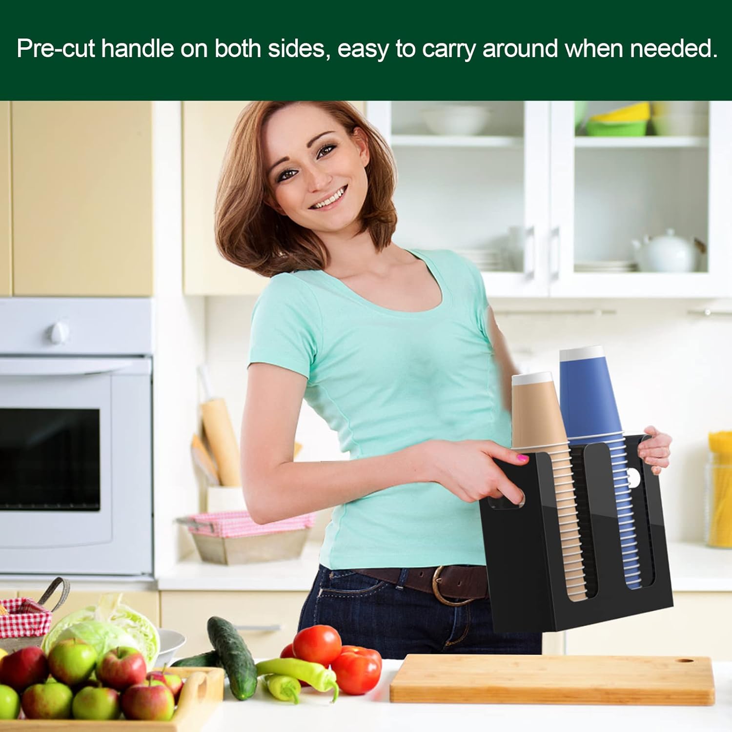 - Cup Dispenser with Handles on Both Sides - pre-drilled handles on side and holes on back, provides more possibilities, either mount it on wall of your kitchen or office, or let it stand along the side of your cabinet in the trailer, you make the decision.