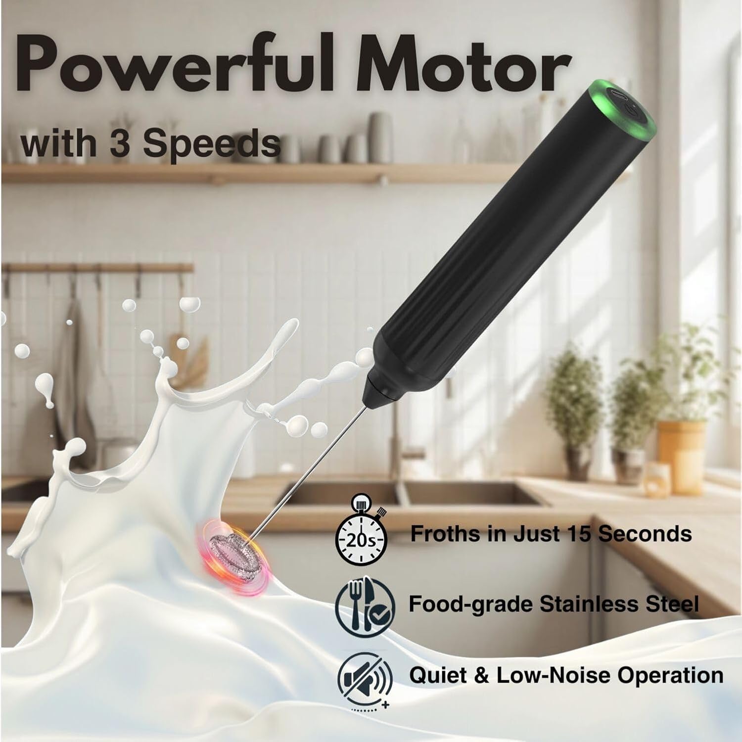 - 【3 Speeds for Fun and Fashion】- The speeds are color-coded for your convenience: Red = Slow, Yellow = Medium, and Green = Fast. To turn on the power, simply press and hold for 2 seconds to start at a slow speed, and press again to switch to a higher speed for the perfect foam texture. Slow speed is great for mixing up juice and eggs, medium speed is perfect for making jam and matcha tea, and high speed is ideal for whipping up coffee, lattes, cappuccinos, and other fun drinks.