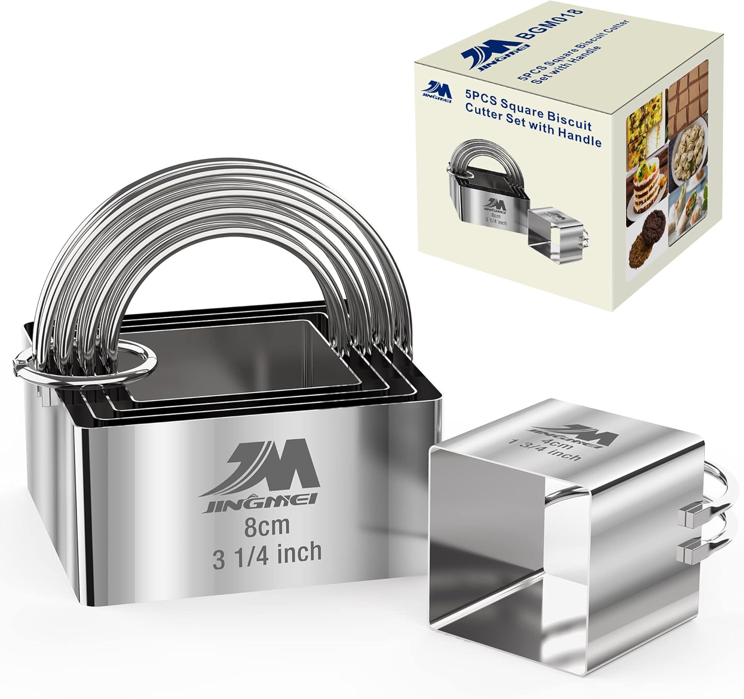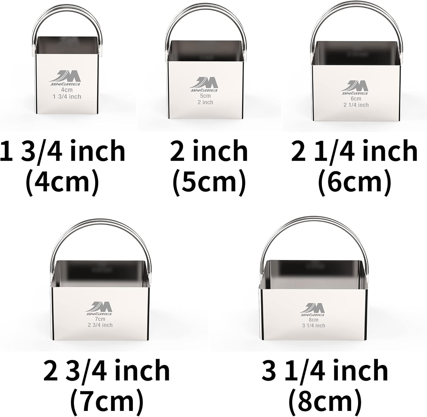 - ❀{5 pcs Square Cutter set }The Square Cookie cutter set of 5 different sizes , Biscuit cutter set/Square cake cutter sizes: Dia. 1 3/4inch(4cm), 2inch(5cm), 2 1/4inch(6cm), 2 3/4inch(7cm),3 1/4inch(8cm). Height: 1 3/4 inch (5 cm). Meet your different needs.