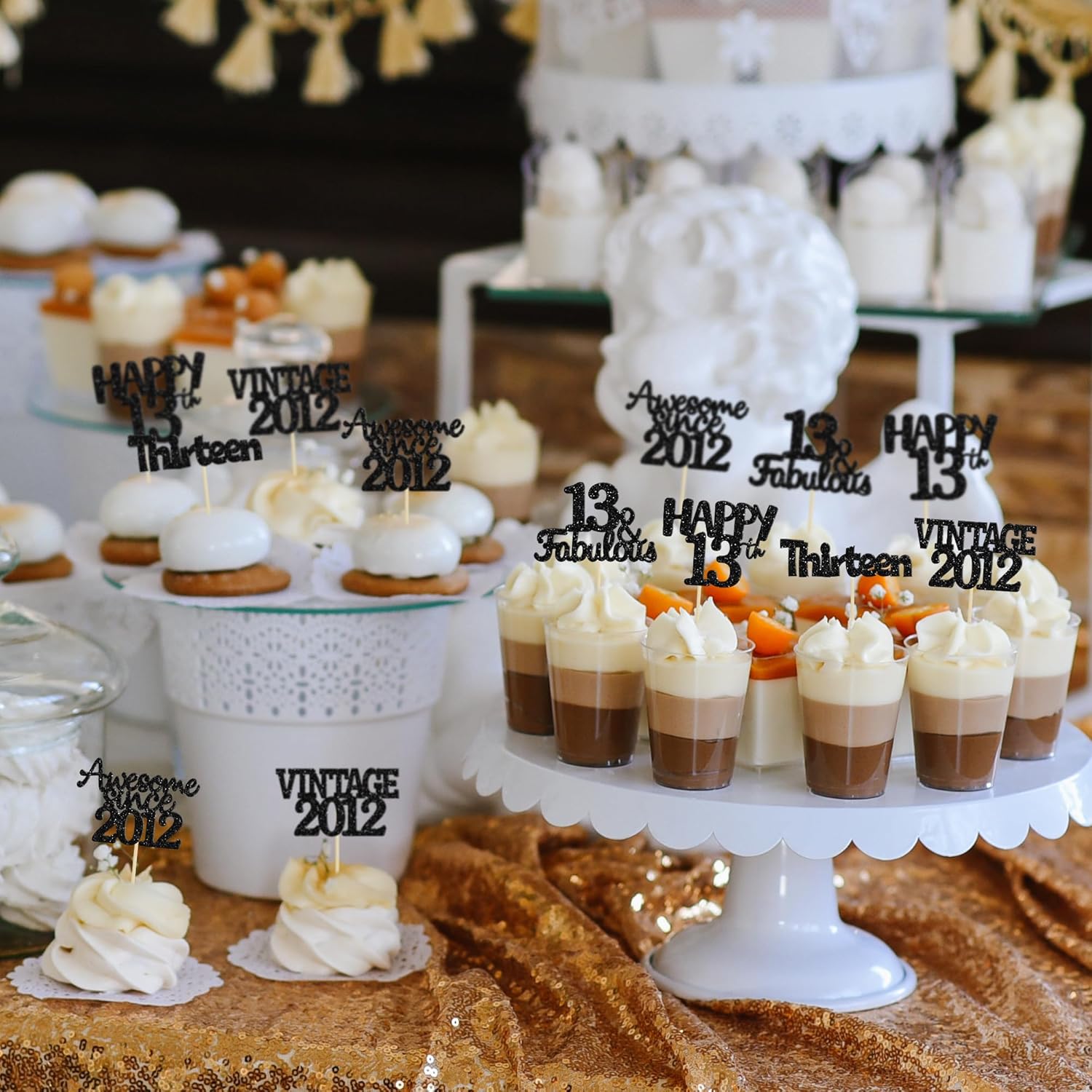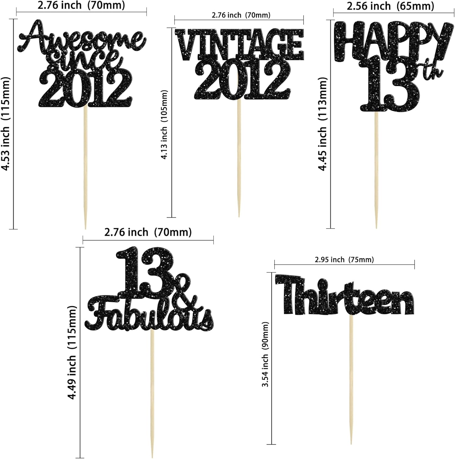 - ♡These glitter 13th birthday Cupcake Toppers are so cute and good for vintage 2012 theme party, 13th birthday party, 13th wedding anniversary birthday party cake decoration. They can make your cupcake more attractive and bring the fun to your party. You can also apply them for ice cream, fruits, cookies and other desserts.