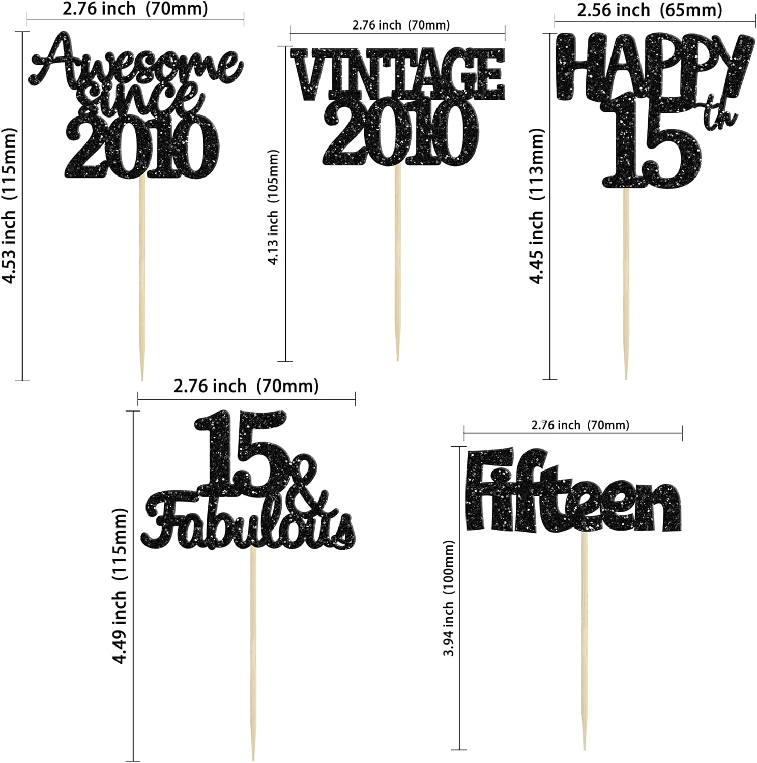 Gyufise 30Pcs Vintage 2010 Cupcake Toppers Glitter Sweet 15 Happy 15th Cupcake Picks Happy 15th Birthday Cake Decorations for Happy 15th Birthday Fabulous Anniversary Party Supplies Black