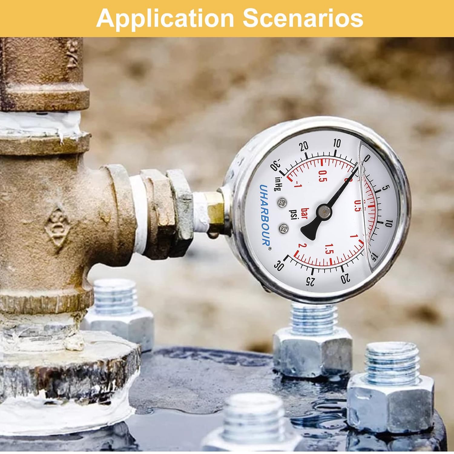 - 1. Precise measurements: The 2.5 inch dial liquid filled pressure vacuum gauge measures pressure from -30 inhg to 30Psi, providing accurate readings for a wide range of applications.