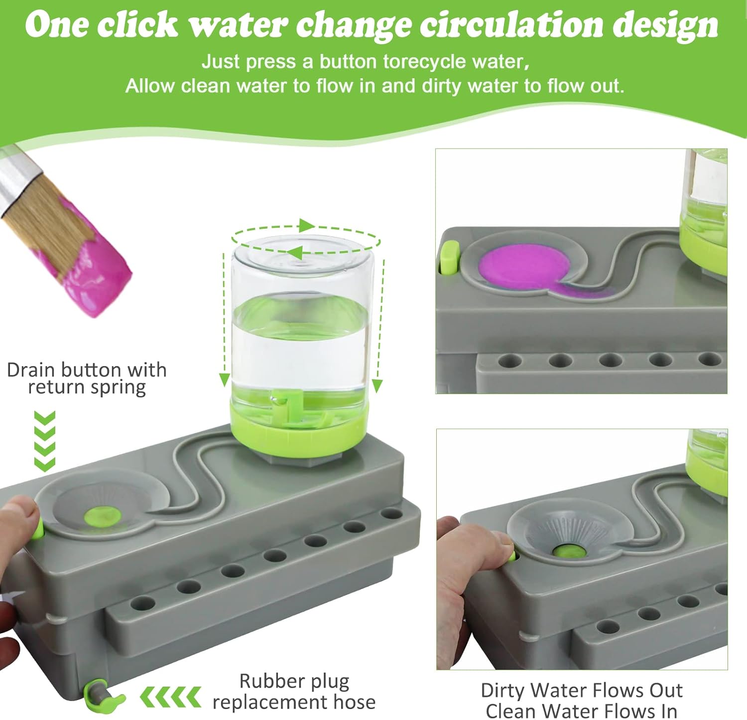 - 【ONE-TOUCH WATER CHANGE】Simply press the button, the painting station sewage will flow into the paint brush cleaner tank bottom, let the channel and the rinsing area refill with clean water, and keep painting. (Our buttons have been upgraded with thicker buttons for better pressing). When you need to clean the brush, just rub the brush sideways over the grooves in the rinse zone.
