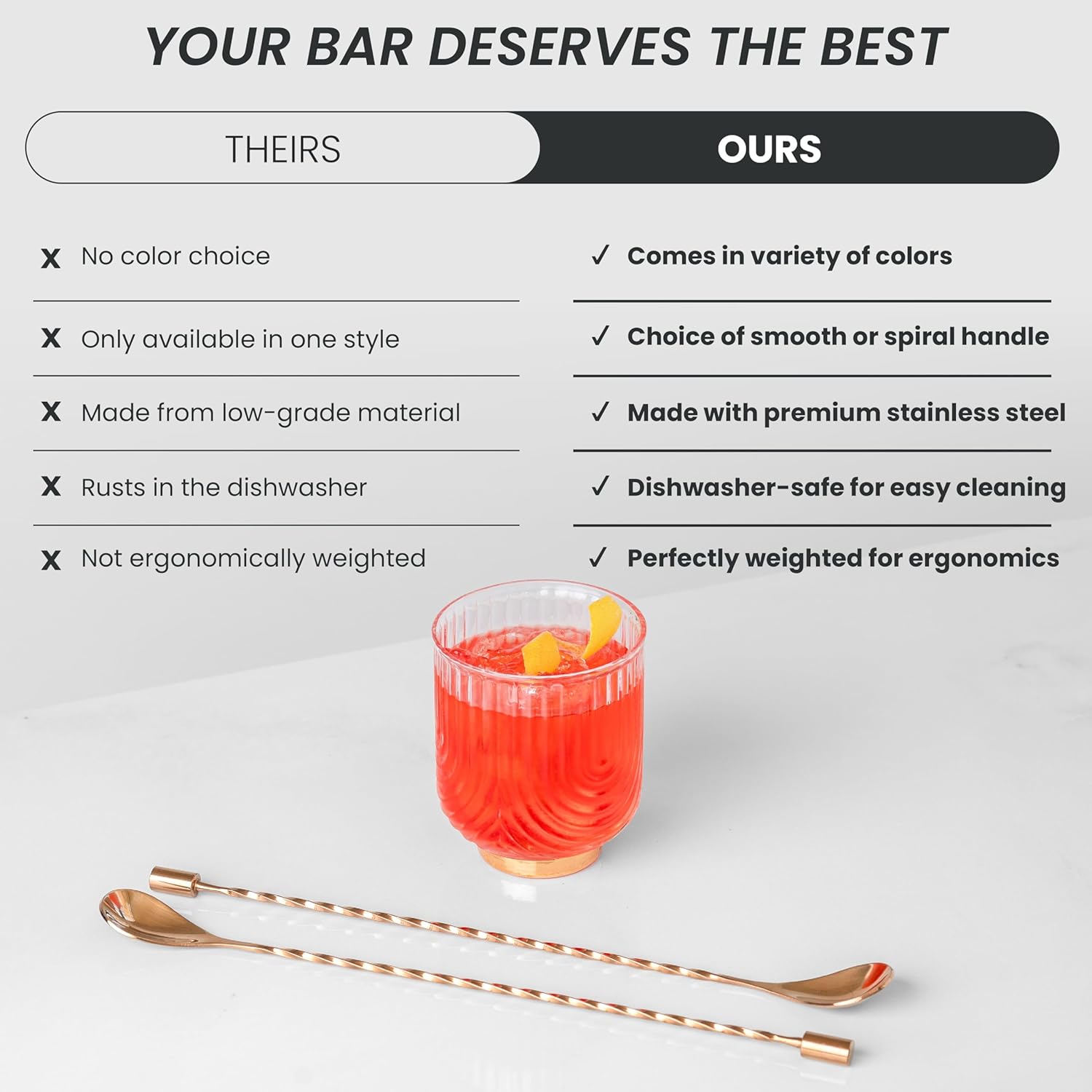 - ENGINEERED FOR CONSISTENCY AND CLEANUP: At 12 inches long with a 2.5 ml spoon bowl, this set fits standard mixing glass depths and is dishwasher safe for efficient cleanup.