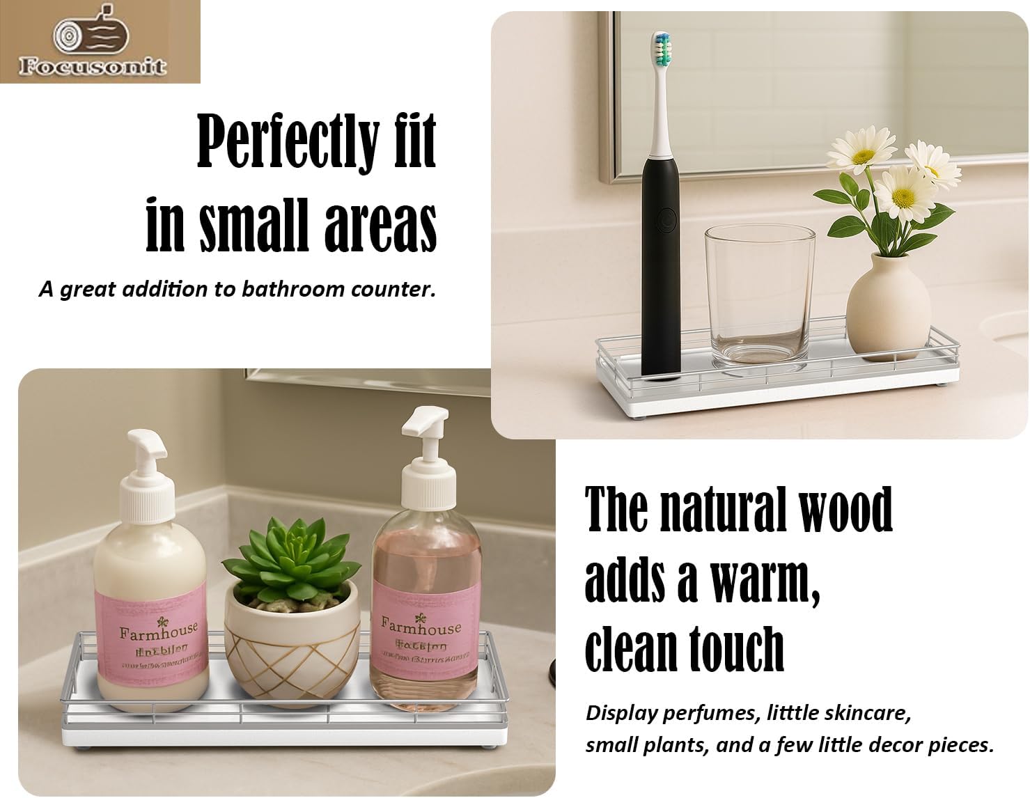 - Versatile Functionality: Elevate your daily routine with our bathroom counter tray; Neatly arrange bathroom essentials like soap, toothbrushes, cotton swab and lotions, keeping your countertop tidy; Add a touch of elegance to your dresser by using the vanity tray to showcase perfumes, jewelry, and cosmetics; Impress your guests with neatly arranged hand towels and toiletries presented on the small tray or use it as a toilet tank tray
