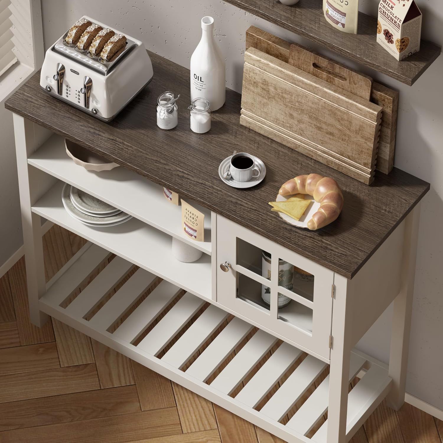 - ăFarmhouse DesignăThe coffee bar cabinet features a rustic light wood grain table top, smooth soft white body, and elegant silver handles, blending retro and modern to create a comfortable and charming farmhouse atmosphere in your home