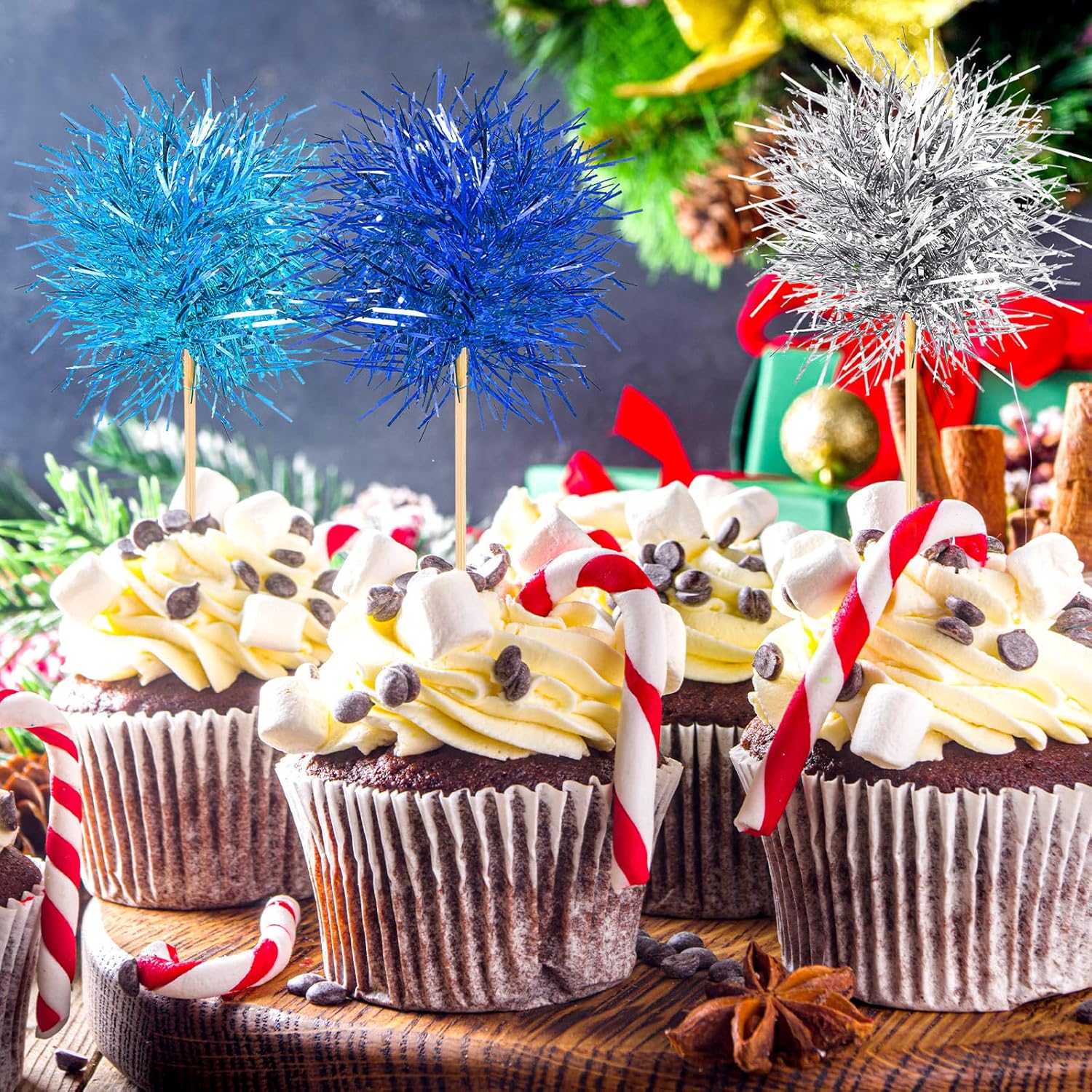 Chinco 100 Pcs Foil Firework Cupcake Toppers Sparkle Tinsel Cake Toppers Cake Decoration Cocktail Fruit Toothpick for Birthday Wedding Graduation Party(Dark Blue, Light Blue, Silver)