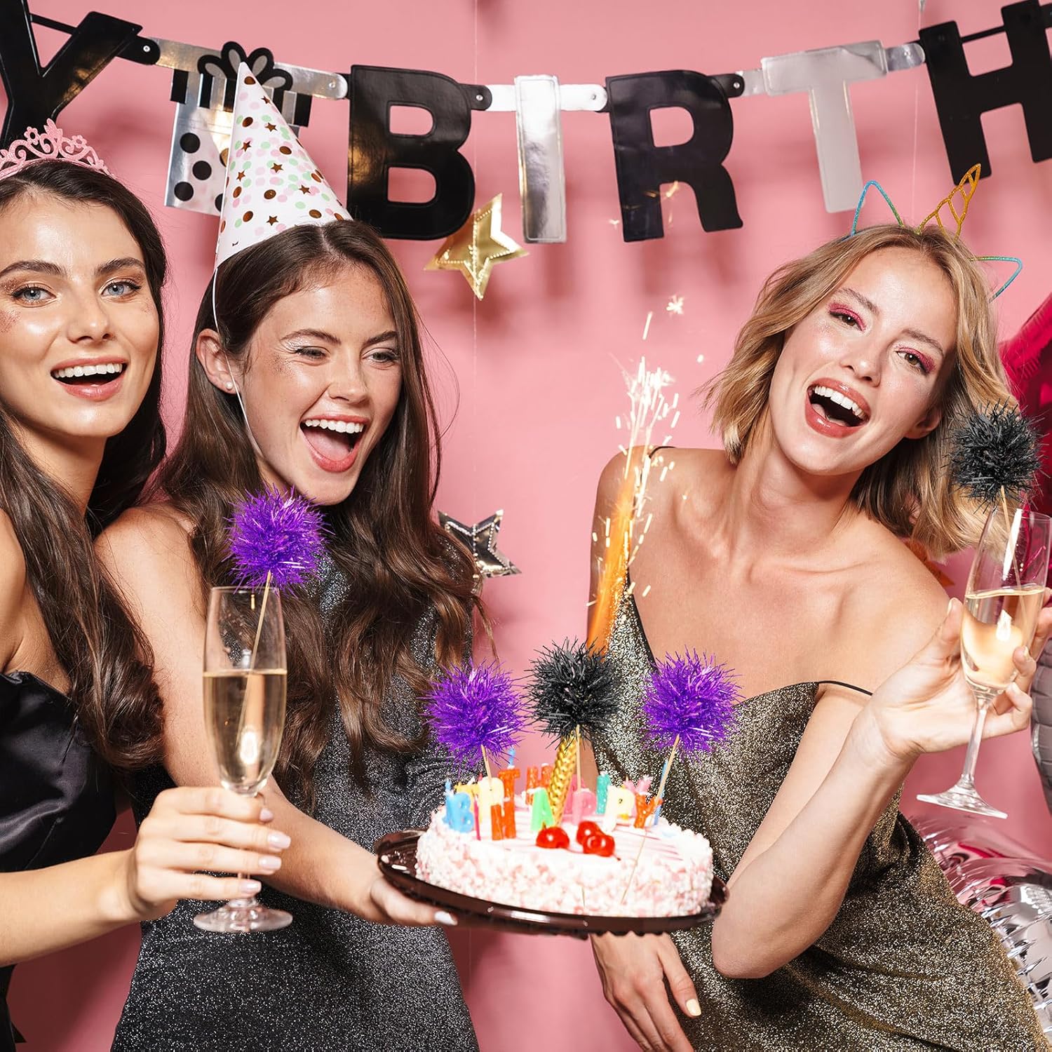 Chinco 100 Pcs Foil Firework Cupcake Toppers Sparkle Tinsel Cake Toppers Cake Decoration Cocktail Fruit Toothpick for Birthday Wedding Graduation Party(Purple, Black)