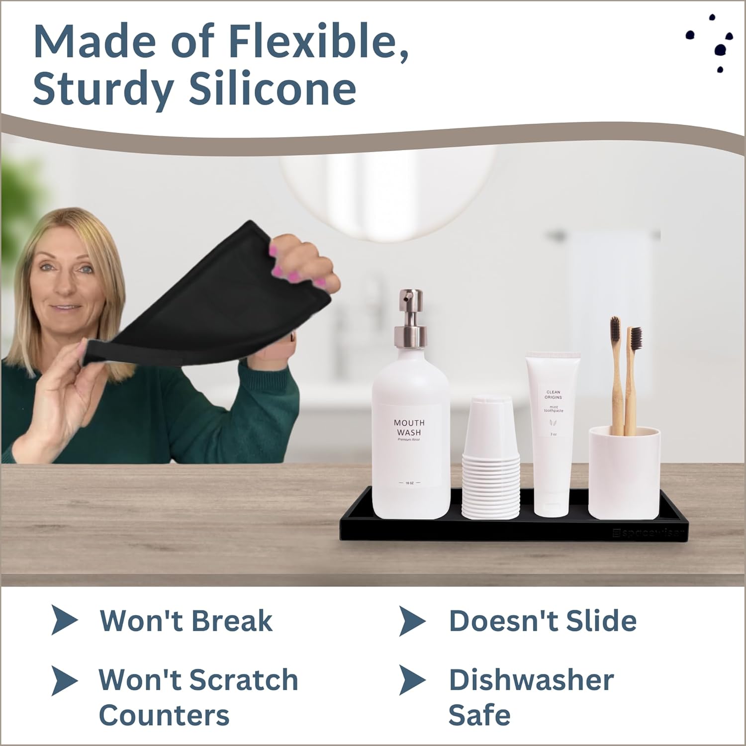 - Use It Anywhere - Choose the endlessly useful tray that works anywhere. The Spacewiser Original Silicone Tray is a perfect bathroom tray countertop accessory, bathroom sink vanity tray, or soap tray for kitchen counter. The tray is made of premium food grade silicone, without the addition of potentially unsafe thickening agents or chemicals. It’s shatterproof, waterproof, slip-resistant, heat resistant to 425F, and dishwasher safe- the perfect black bathroom trays for counter or sink organizer.