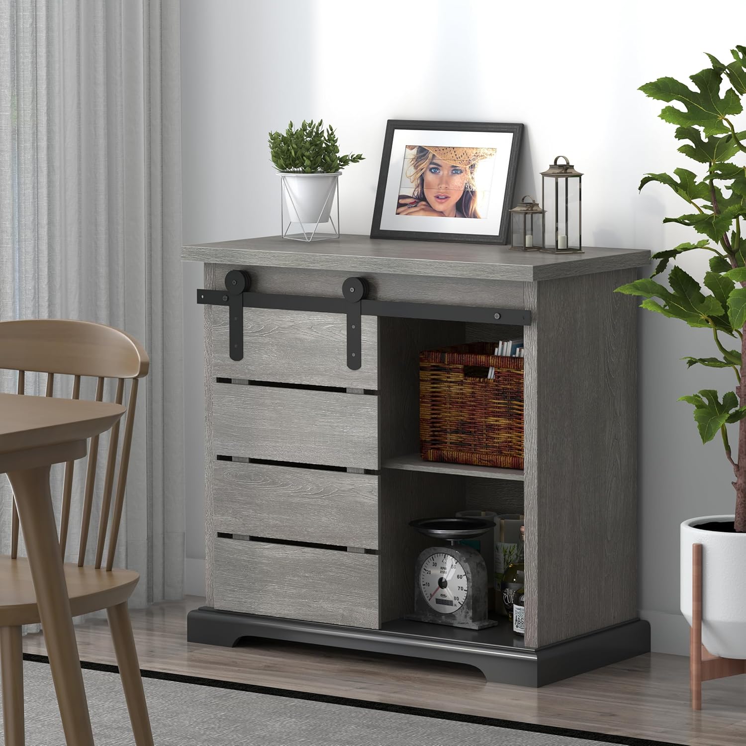 - [Easying Sliding Barn Door]: Our sliding storage cabinet is built with single slat door running on a metal rod and two sets of pulleys. Thanks to this structure, this sliding style does a good job of saving space and thus is great for small rooms.