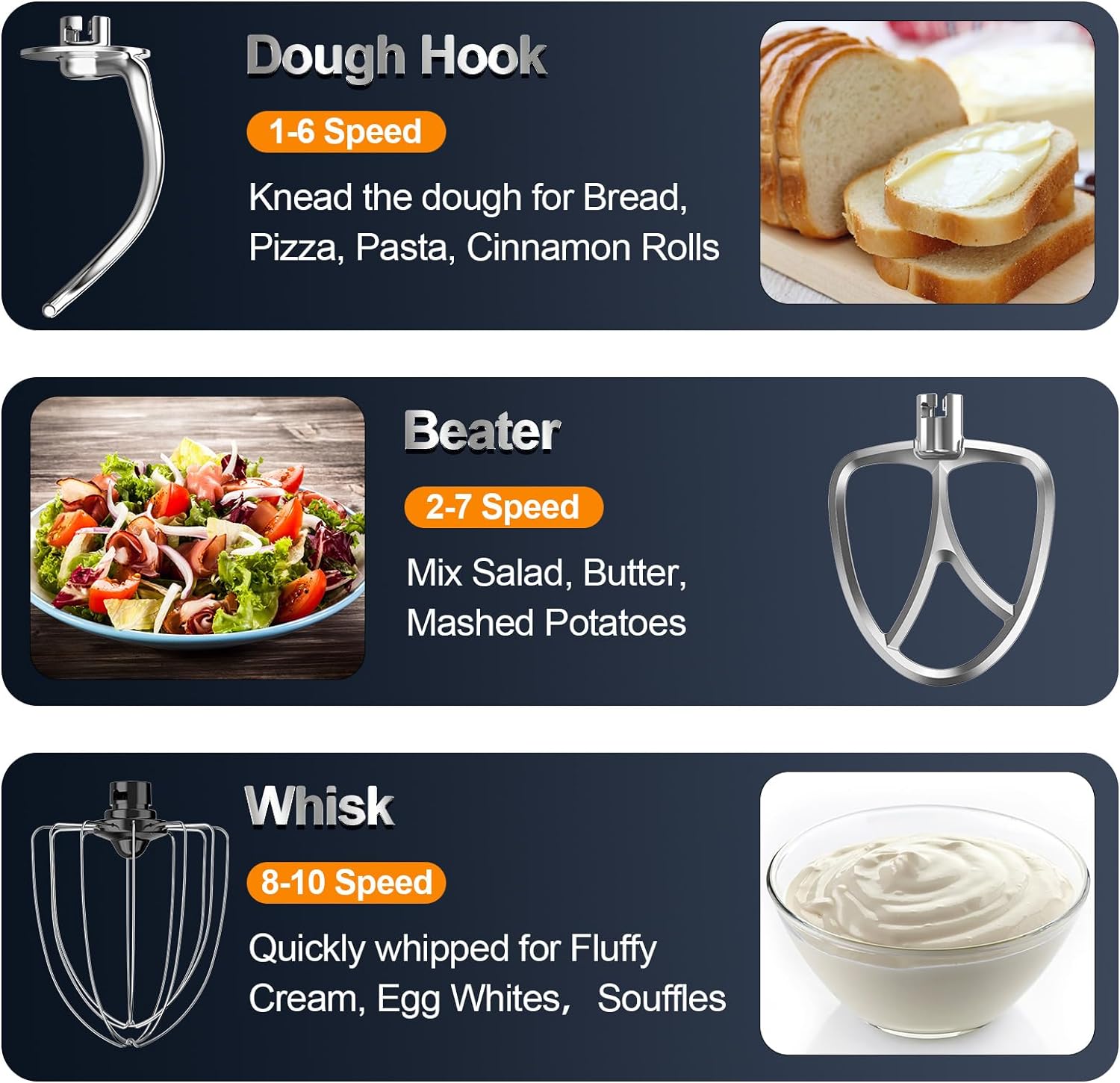 - ăMultiple AccessoriesăHoninst Household Stand Mixer comes with 3 accessories: dough hook, whisk and beater, all obtained Food Safety ETL Certification. From whipping cream to kneading dough, from bread, cakes, pizzas to pastry, muffins and waffle, meet all your cooking needs and free your hands for easy cooking.