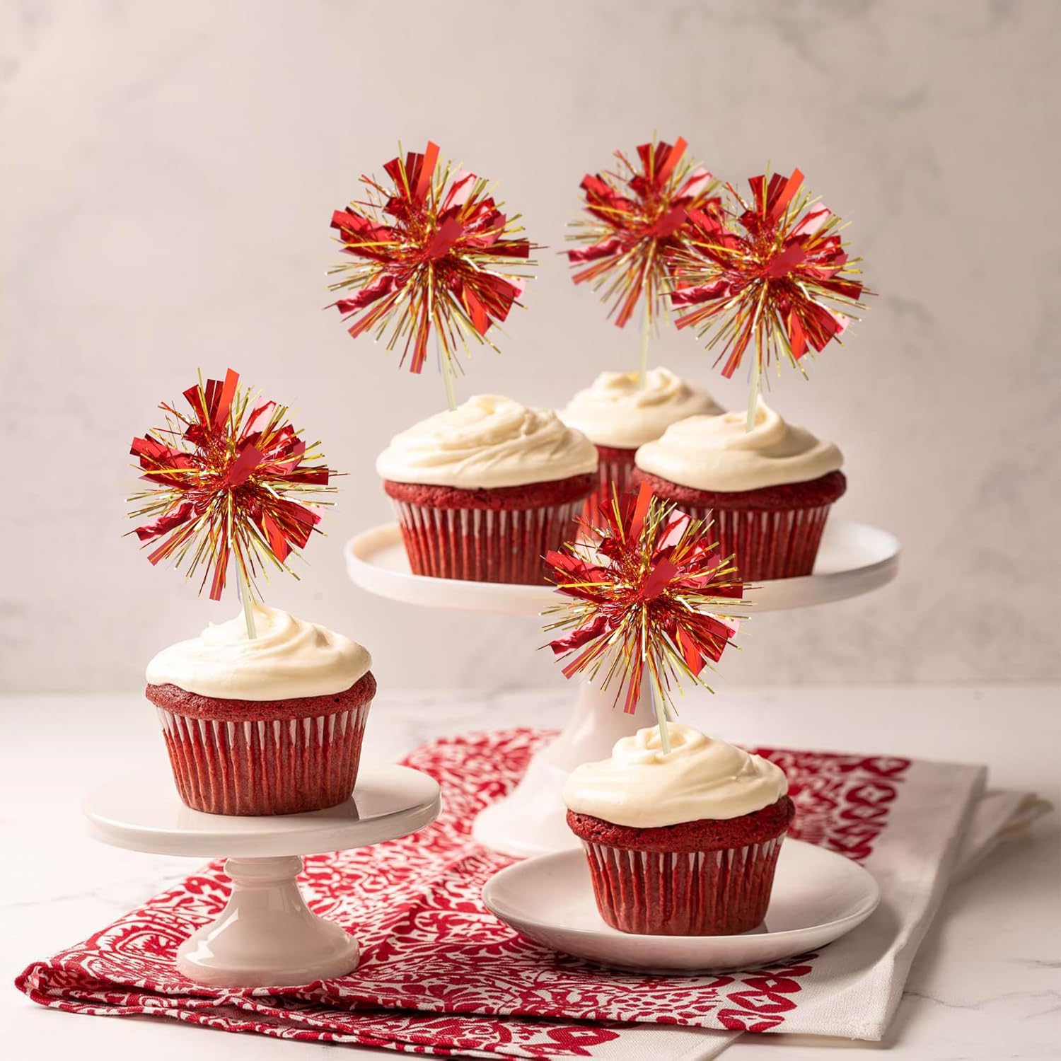 Gyufise 20Pcs Foil Firework Cupcake Toppers Sparkle Tinsel Cake Toppers Tinsel Drink Cake Decoration Cocktail Picks for Birthday Wedding Graduation Party Supplies Gold Red