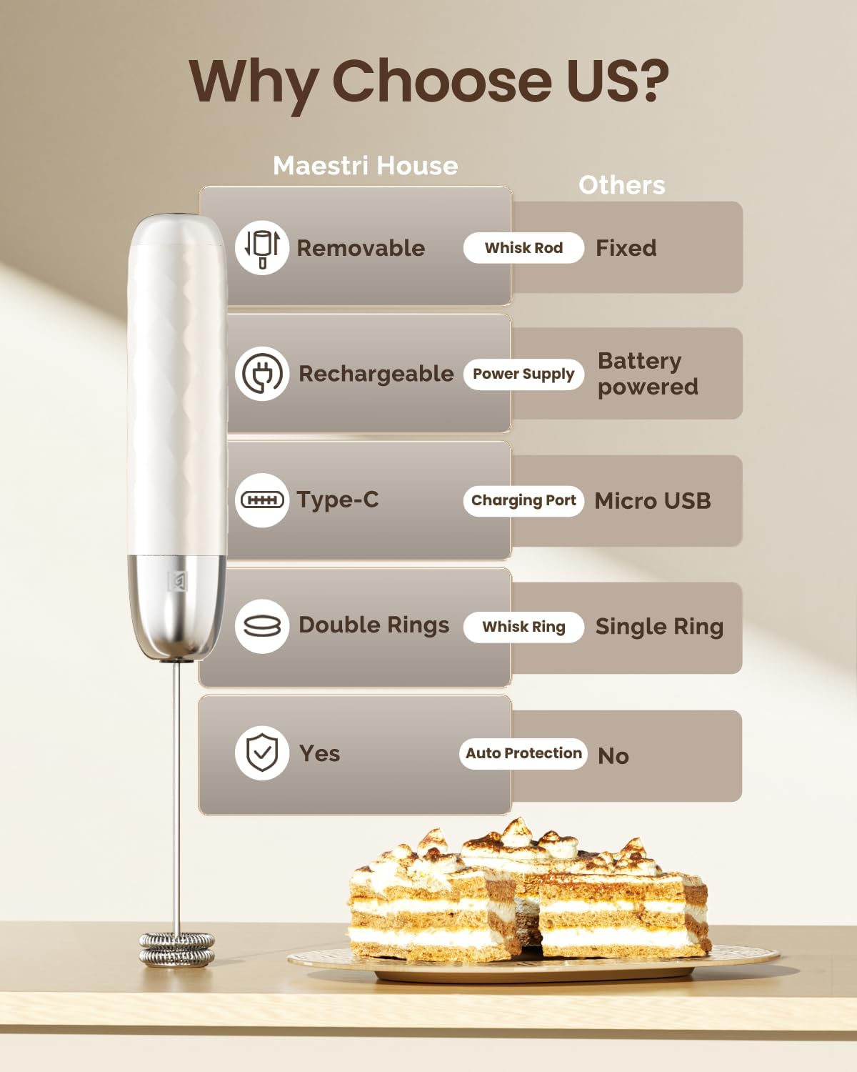 Maestri House Rechargeable Milk Frother, LunaFro Mini Handheld Electric Foam Maker Detachable Stainless Steel Whisk Drink Mixer Foamer Mini Blender for Matcha, Lattes, Cappuccino, No Stand