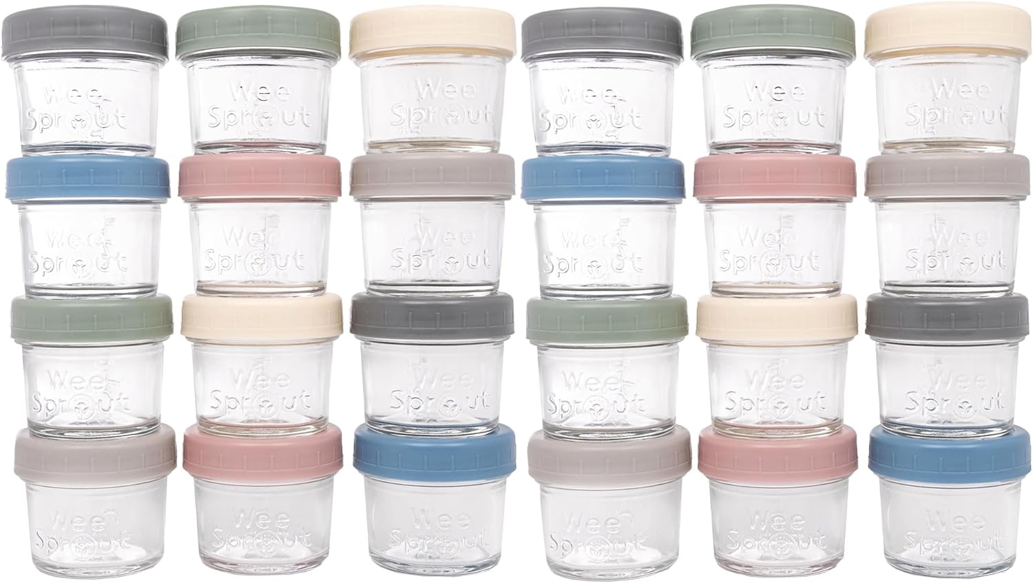 WeeSprout Baby Food Storage Glass Jars w/Lids (4 oz, 24 Pack) Matte Variety, Snack, Reusable Small Containers, Fridge or Freezer, Microwave & Dishwasher Safe, Essentials for Infants