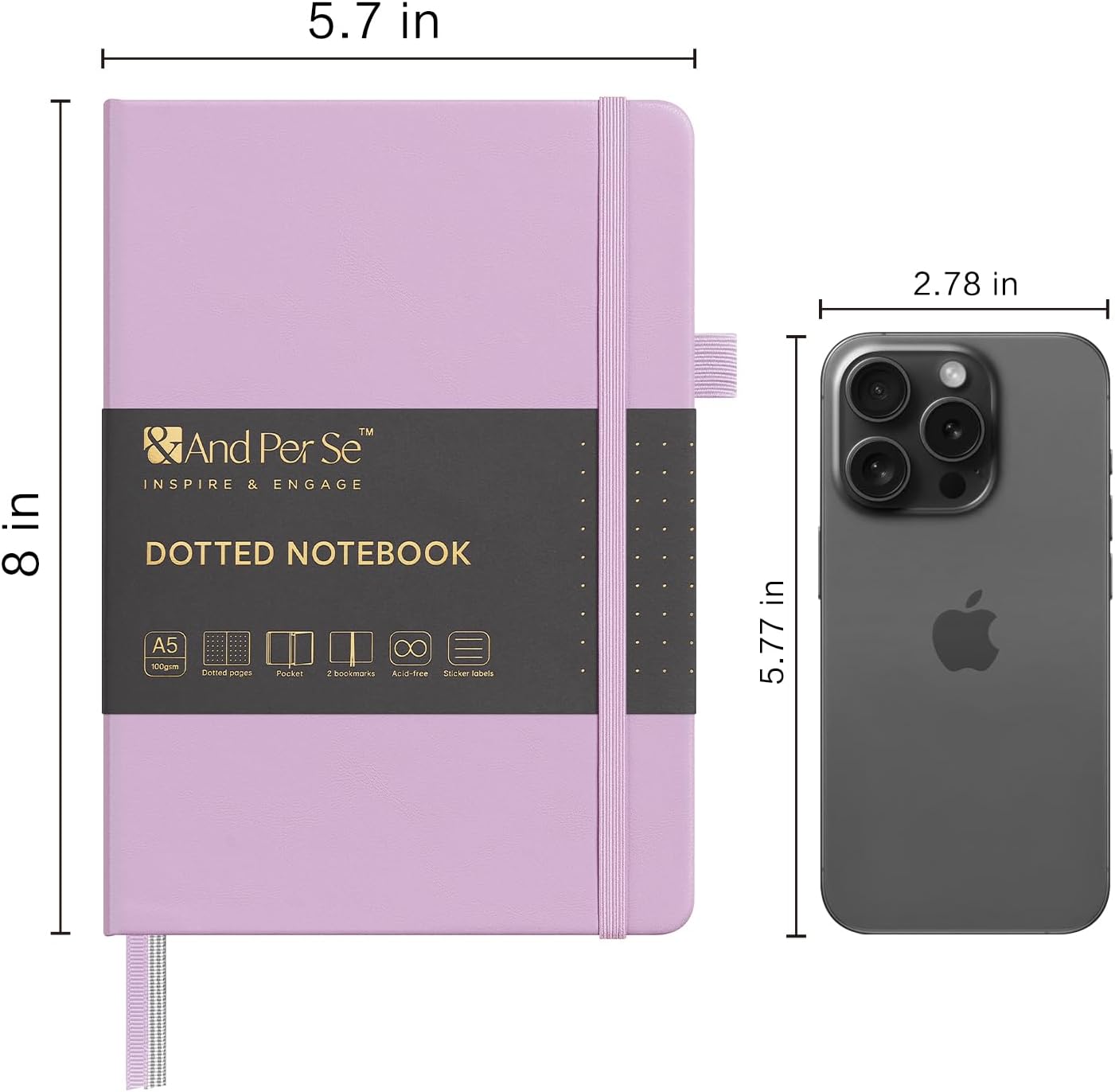 &And Per Se Dotted Journal Notebook, A5 Hardcover Leather Bullet Dotted Journal, 160 Pages 100 gsm Thick Dotted Paper,3 Sheets of Stickers Included - 5.7'' x 8'' (Light lavender)