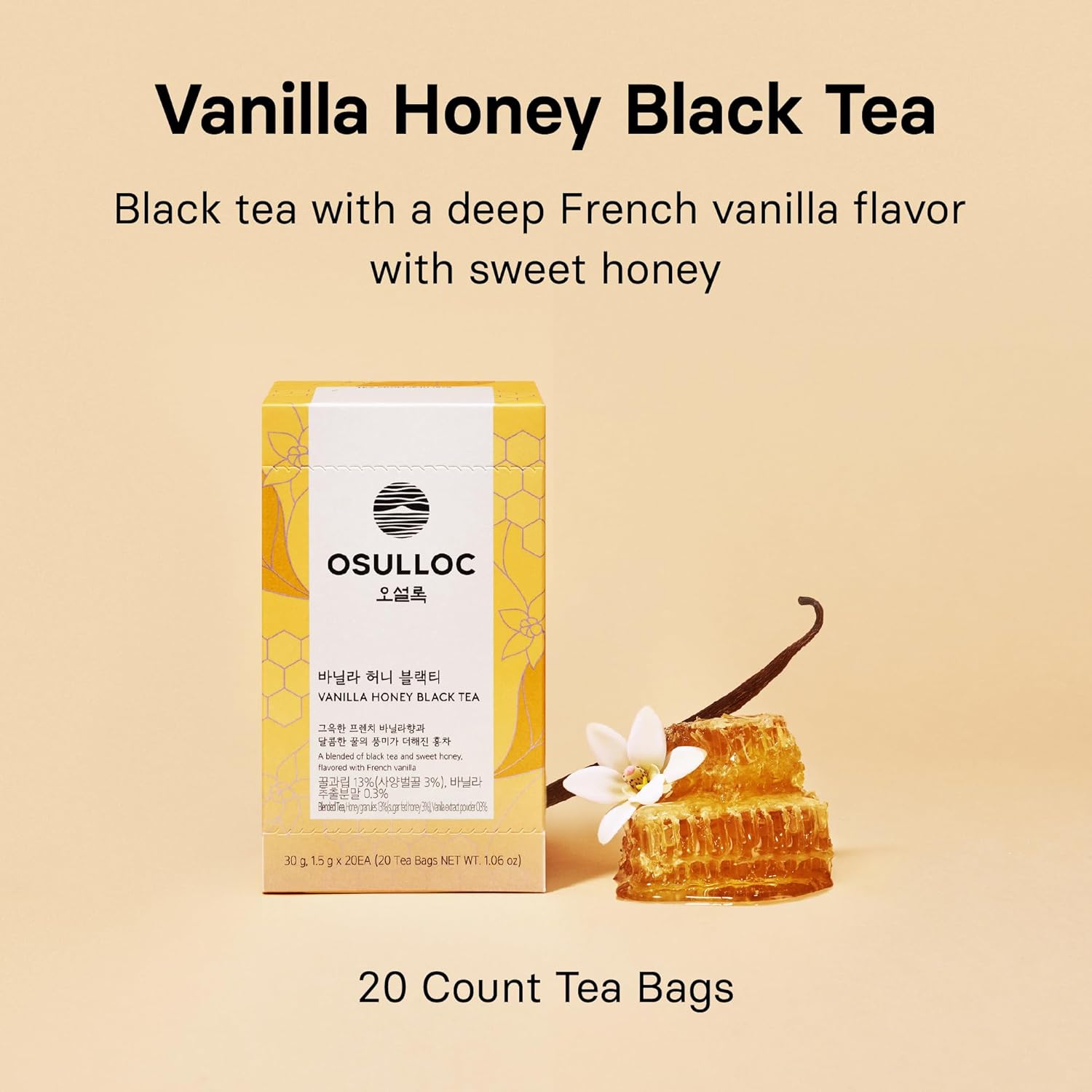 OSULLOC Vanilla Honey Black Tea (20 count, 1.05 oz), Black tea filled with Sweet Flavor of French Vanilla and Honey, Premium Blended Tea bags from Jeju Island