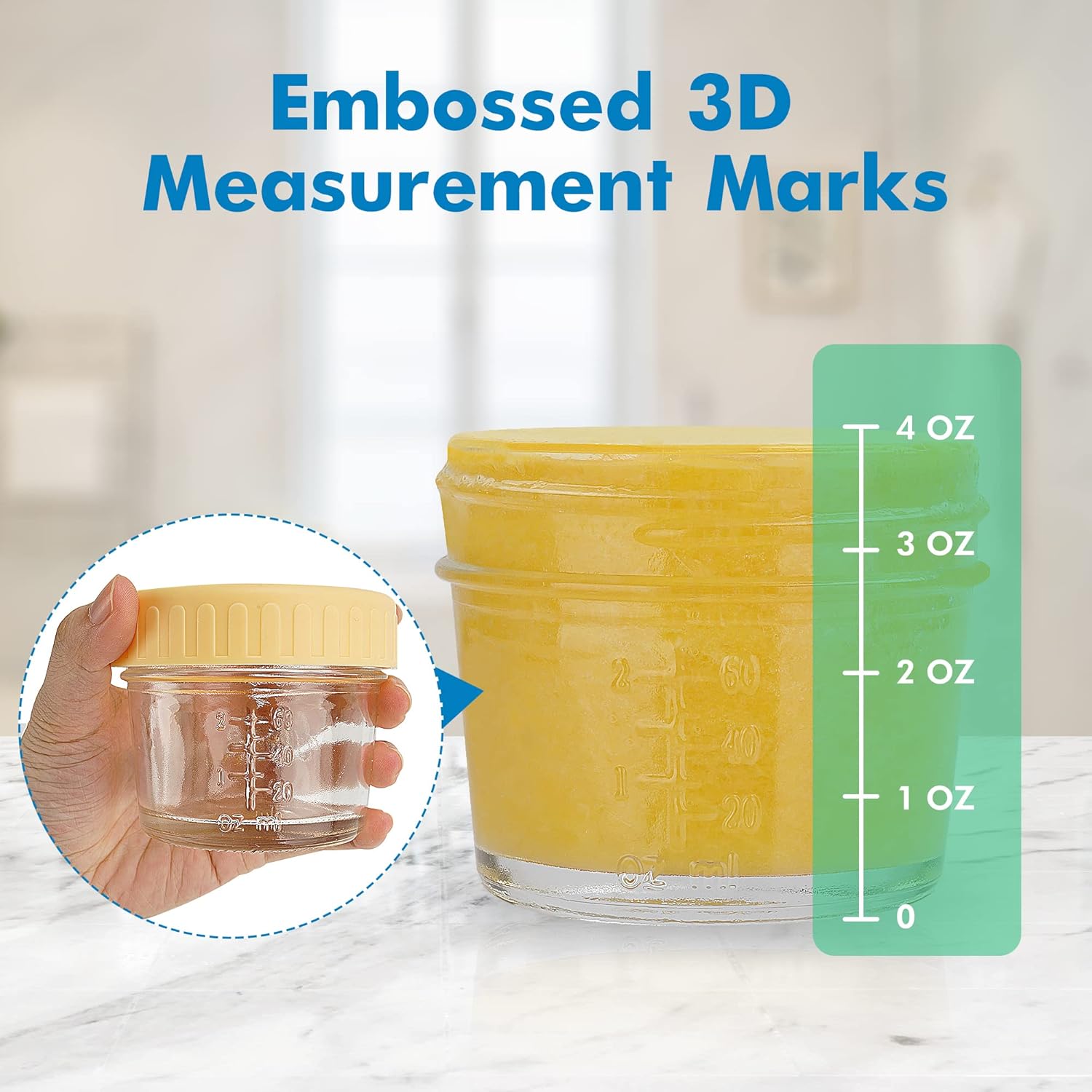 - GREAT VALUE 6-PACK 4OZ GLASS BABY FOOD JARS: The jars come with easy-to-see, non-fading embossed measurement marks showing up to 2oz, however, when filled to the rim, the jar’s capacity is 4oz. Perfect portion size for your baby or toddler and the 6-pack makes it easy for you to offer a variety of homemade foods for a healthy and balanced diet.