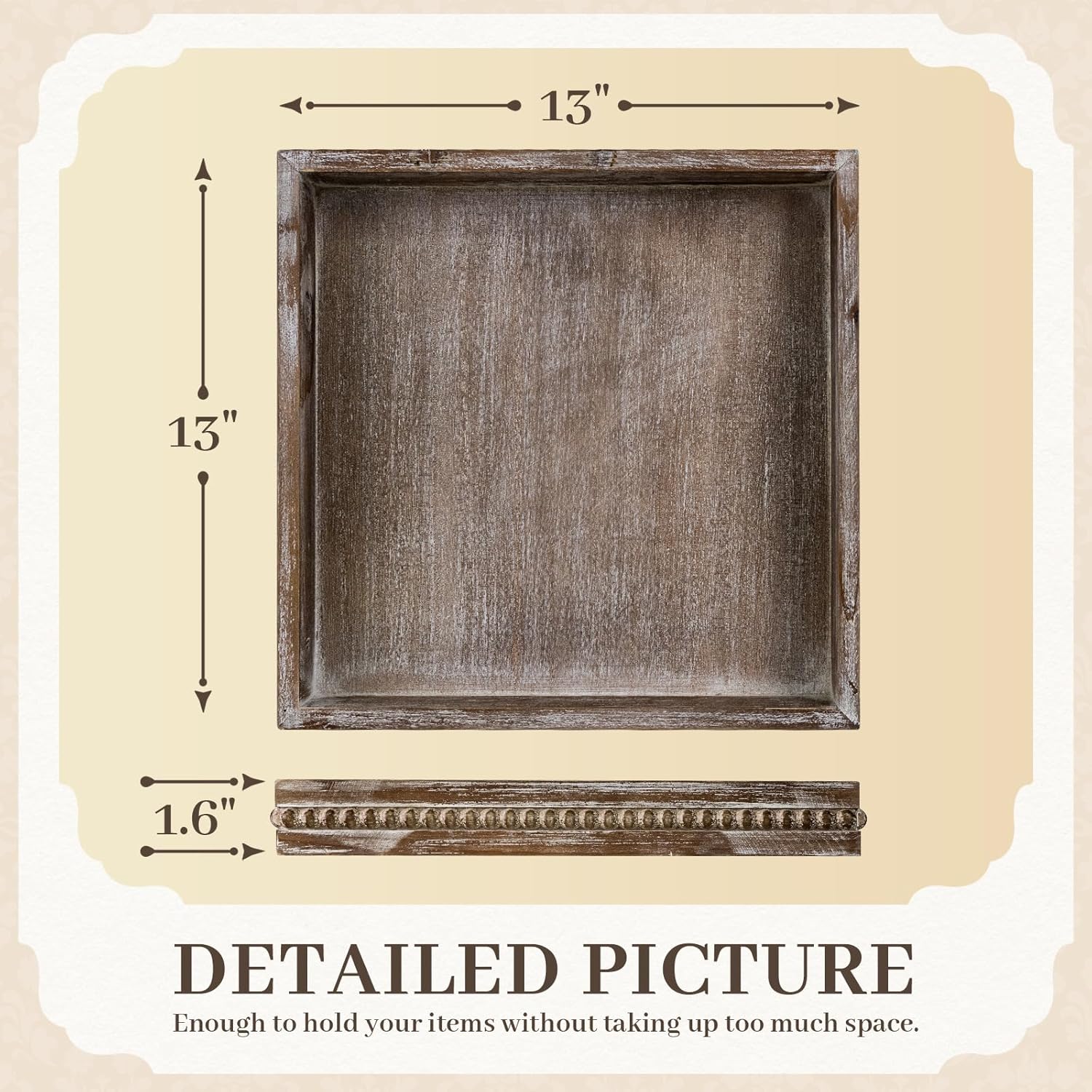 - [Carefully Designed]: He's not an oversized tray just larger than the regular siz, Each farmhouse decorative tray is handmade by skilled craftsmen. Designed to be 1” larger than the usual regular sized trays of 13" x 13" x 1.6" wooden tray is not only more practical but also beautiful to decorate, adding a unique and elegant touch to your home.