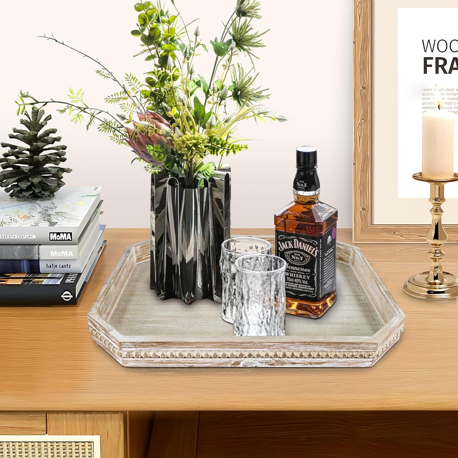 - [Vintage wooden tray]: The wooden tray has a unique design, and the tray is surrounded by resin beads, which is more textured than plastic beads. The surface is polished to retain the wood grain, and matched with White Washed color, it has a natural and vintage feel. Whether it is to greet friends or relatives, this wooden tray can show your elegant taste and bring a warm and fashionable atmosphere to the home environment.