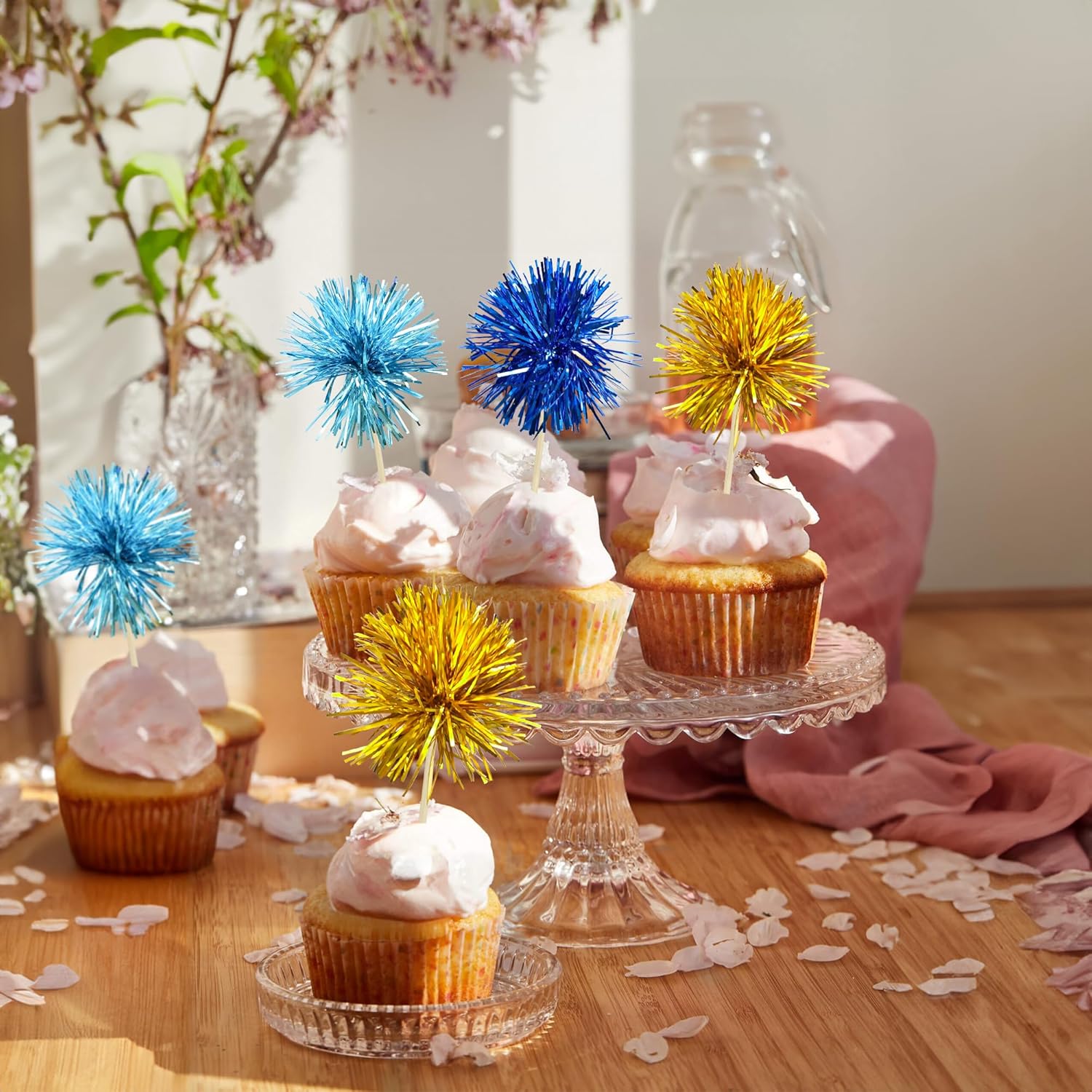 Gyufise 30Pcs Foil Firework Cupcake Toppers Sparkle Tinsel Cake Toppers Tinsel Drink Cake Decoration Cocktail Picks for Birthday Wedding Graduation Party Supplies Gold Light Dark Blue