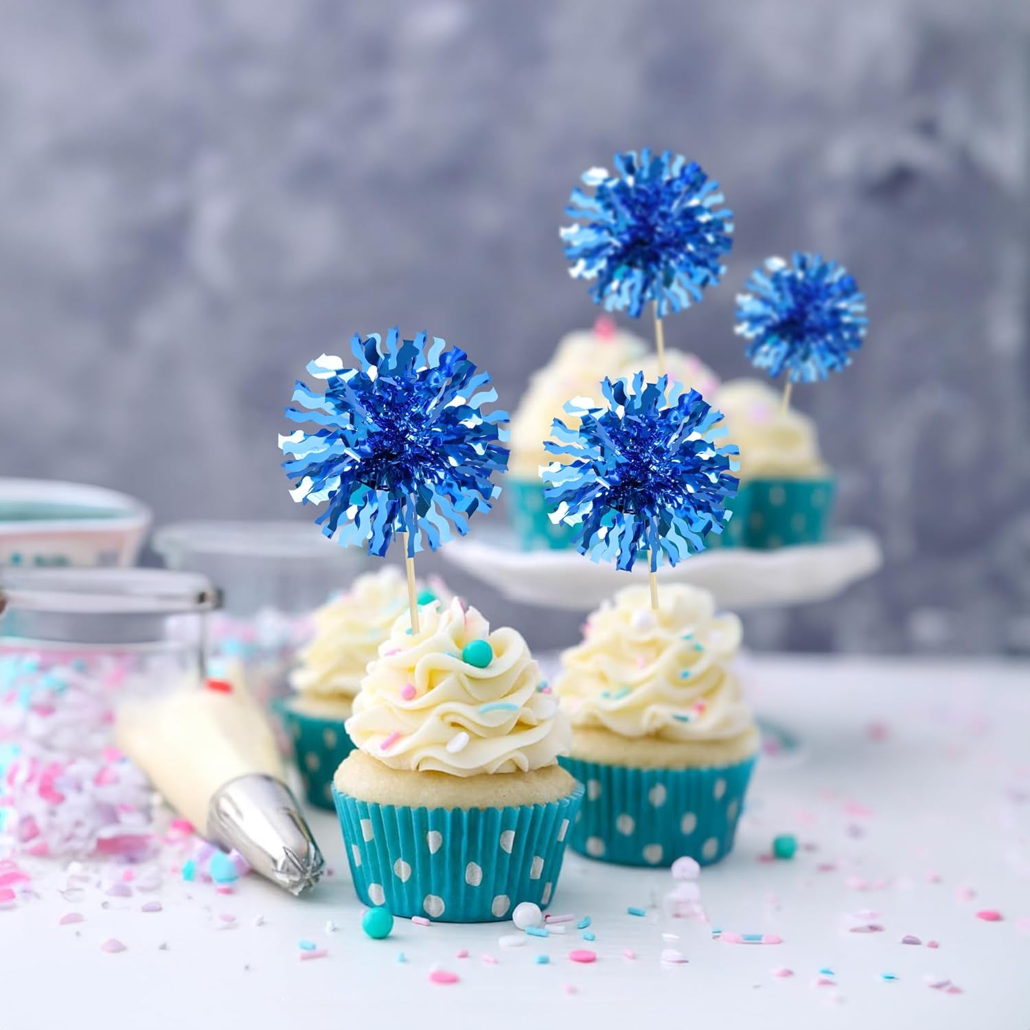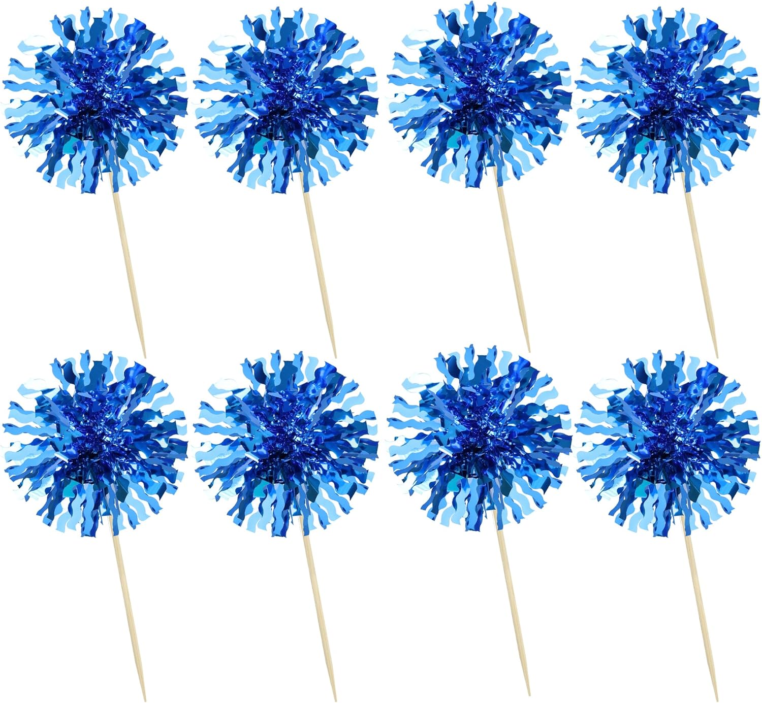 Ephlyn 30Pcs Foil Firework Cupcake Toppers Blue Tinsel Flower Drink Stirrers Cocktail Food Fruit Cake Toppers for Valentine's Day Party Decorations Blue