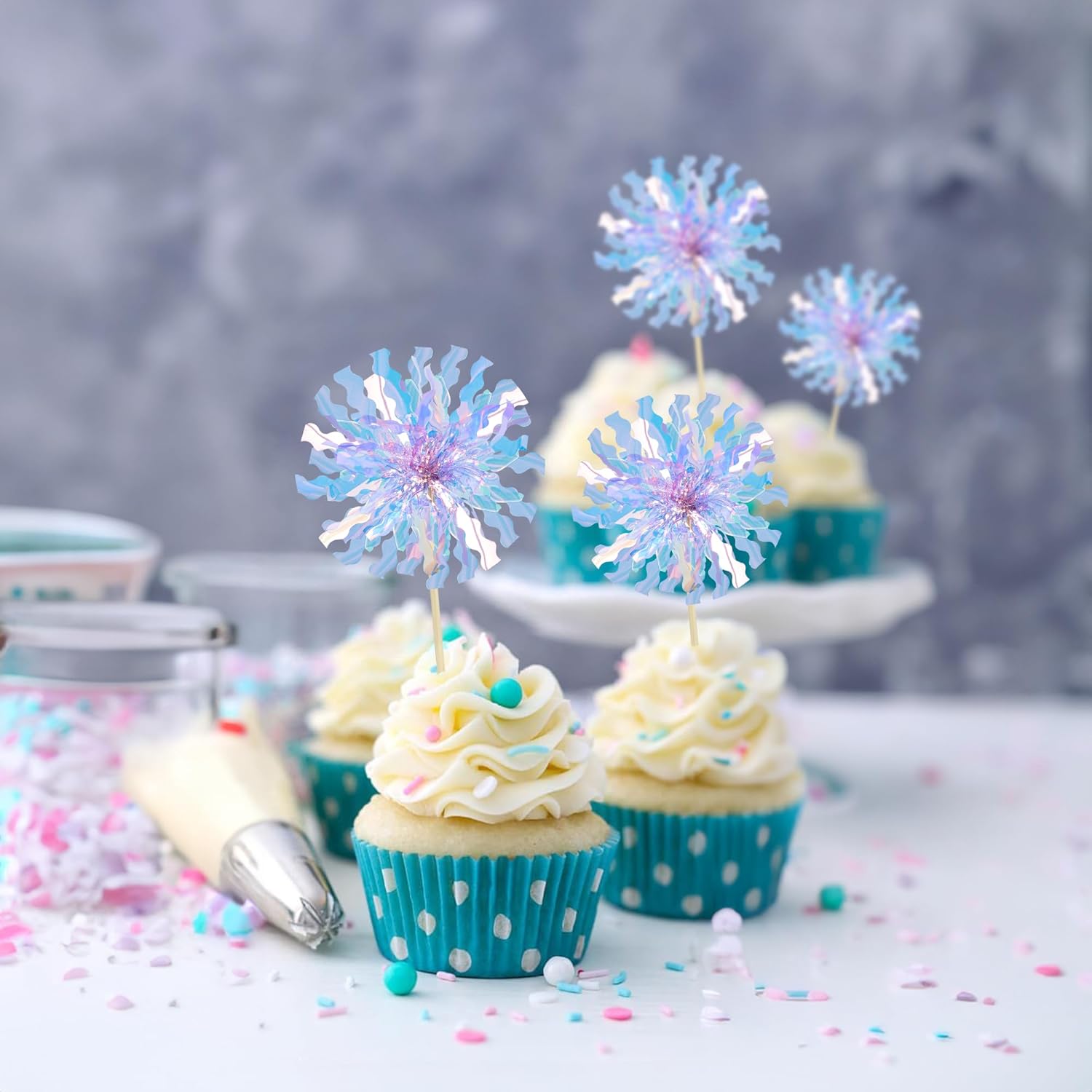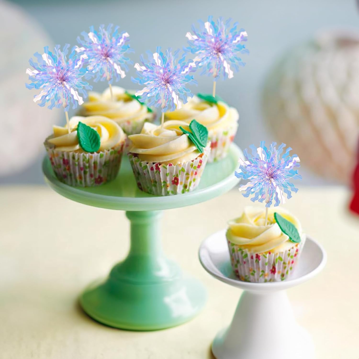 Ephlyn 30Pcs Foil Firework Cupcake Toppers Party Birthday Cake Toppers Supplies Sparkle Tinsel Cocktail Fruit Toothpick for Birthday Wedding Graduation Party Light Blue