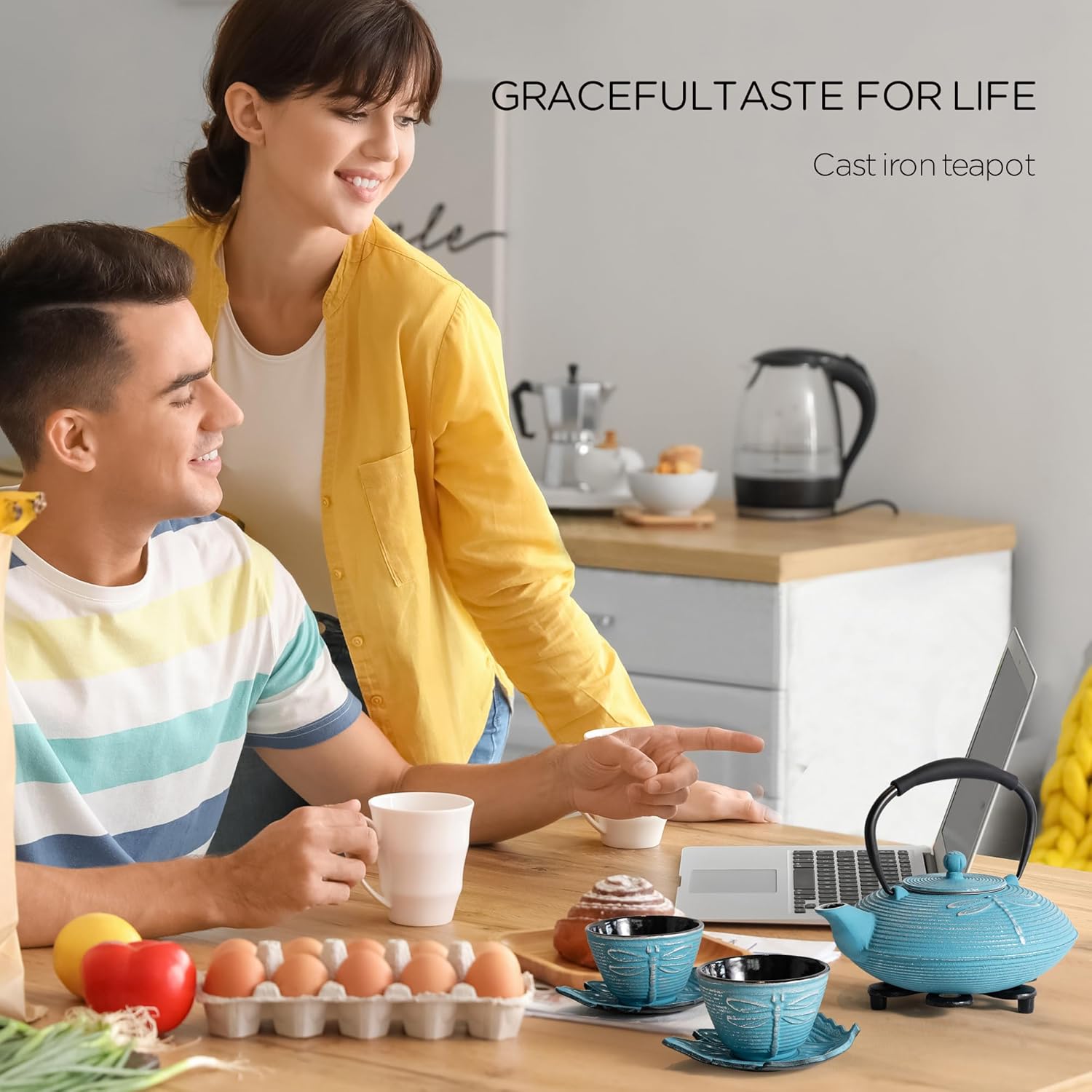 Cast Iron Teapot Set with 2 Tea Cups, 7 Pcs Japanese Tea Kettle with Stainless Steel Infuser, Tea Pot Coated with Enameled Interior, Dragonfly Pattern, 28oz 800ml Blue