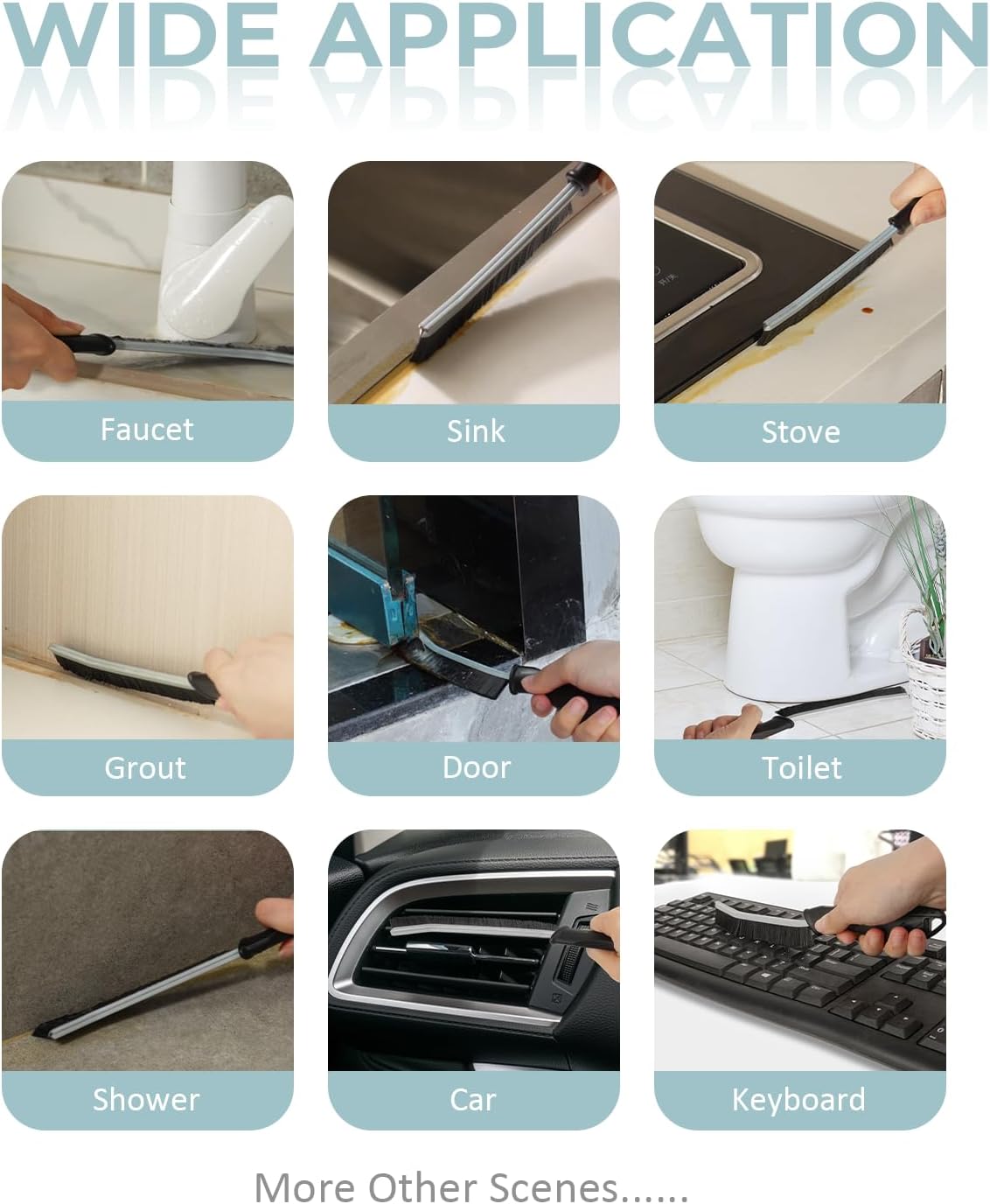 - Multifunctional Brushes: Suit for cleaning hard to reach and tight spots spaces, windowsills, tile countertop grout lines, sink, corners, fans, shower stand, stove, fridge gaskets, furniture, bathroom tub, closet, door tracks, bird feeders, car, etc