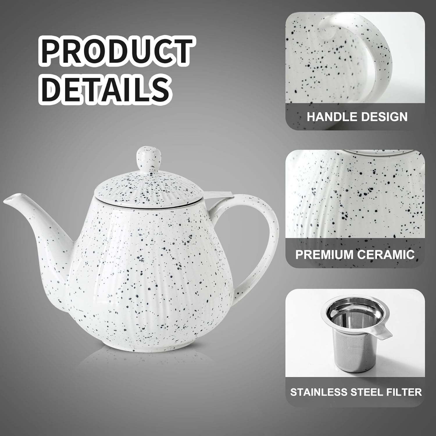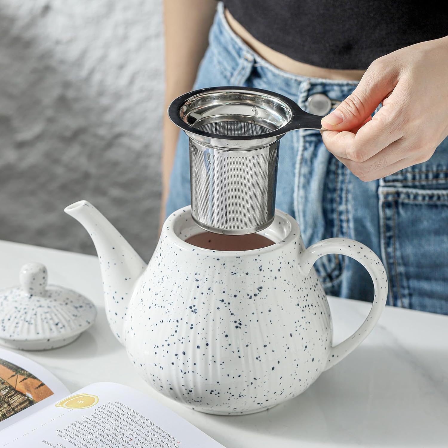KOOV Ceramic Teapot with Infuser, 40 ounce Tea Pot with Infuser for Loose Tea, Large Enough For 6 Cups, Tea Pot with Tea Strainers, Splash Series (Splashed White)